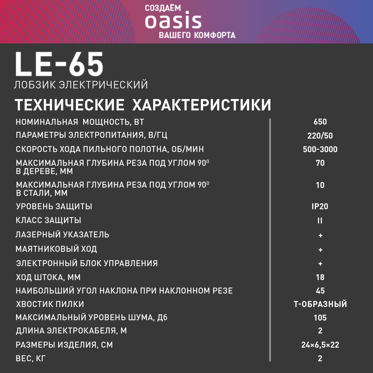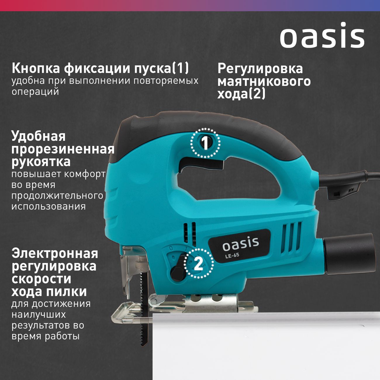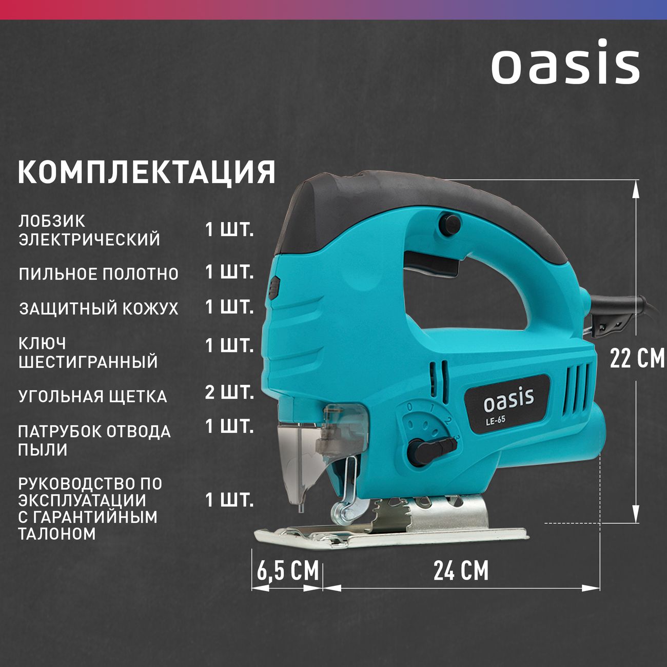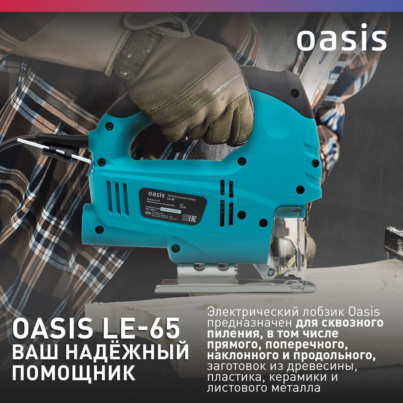 Вы можете купить Электролобзик Oasis LE-65 в магазинах М.Видео по доступной цене. Электролобзик Oasis LE-65: подробное описание, фото и отзывы реальных покупателей, характеристики, возможность скачать инструкции и подобрать аксессуары.