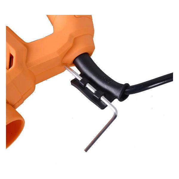 Инструмент оснащен скобовидной ручкой с прорезиненным покрытием, что гарантирует надежный хват. Штампованная подошва из стали устойчива к механическим повреждениям. Корпус выполнен из ударопрочного пластика. В комплекте — шестигранный ключ и параллельная направляющая. Последняя позволяет добиться точного и качественного распила. Длина кабеля — 2 м.
