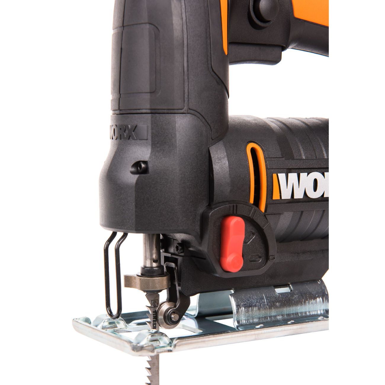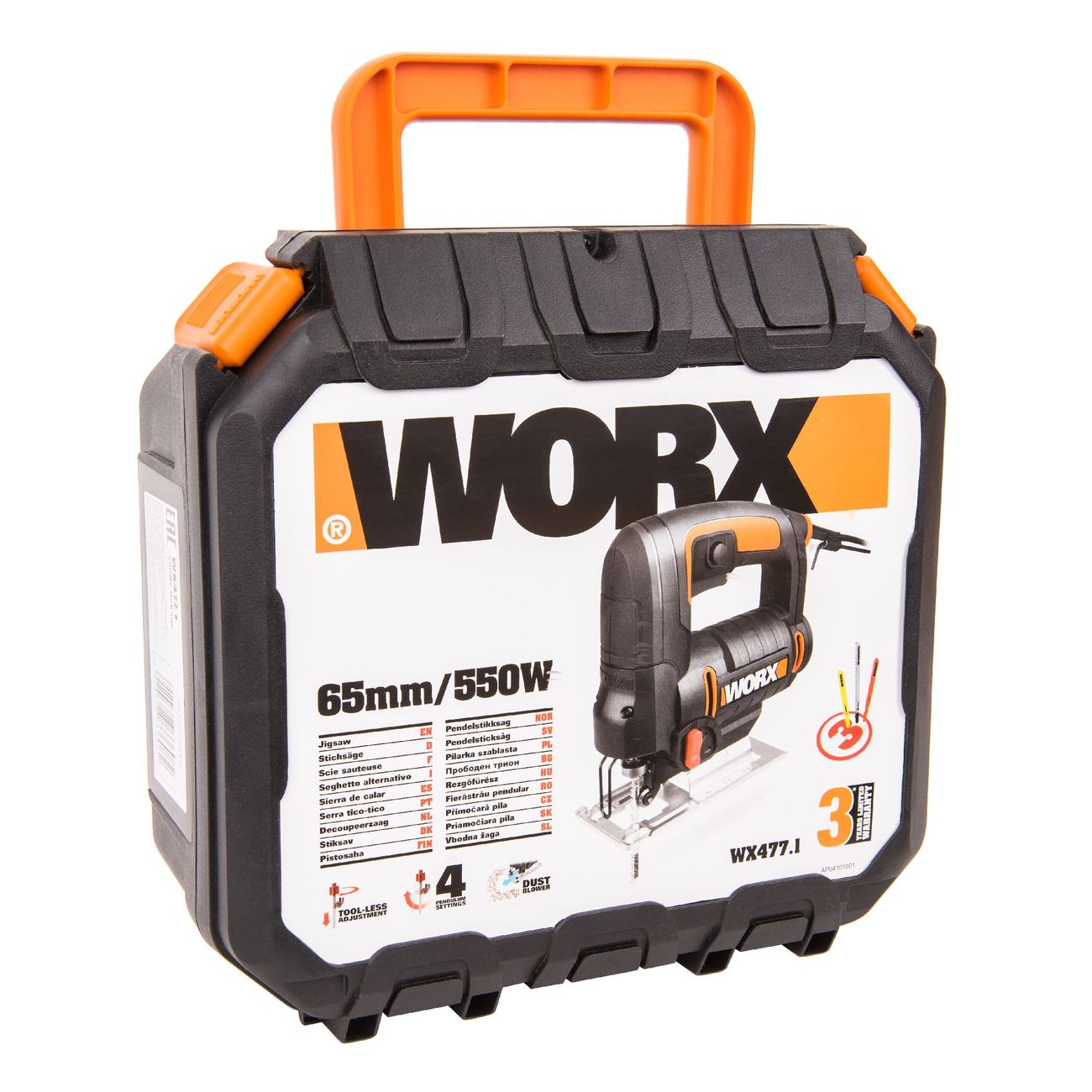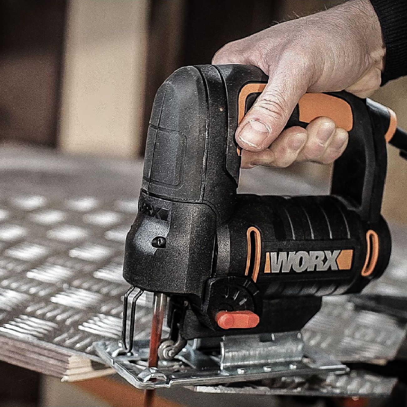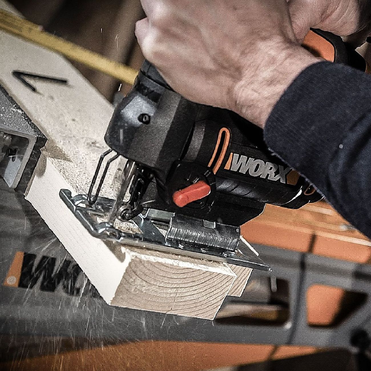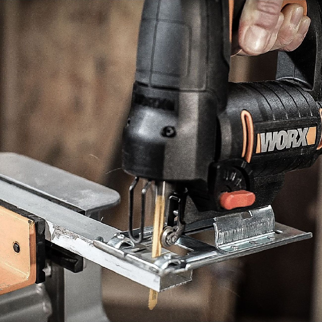 У электролобзика Worx WX477.1 четыре режима маятникового хода — это повышает эффективность выполняемой резки. Основание устройства можно настроить для пиления под определенным углом.