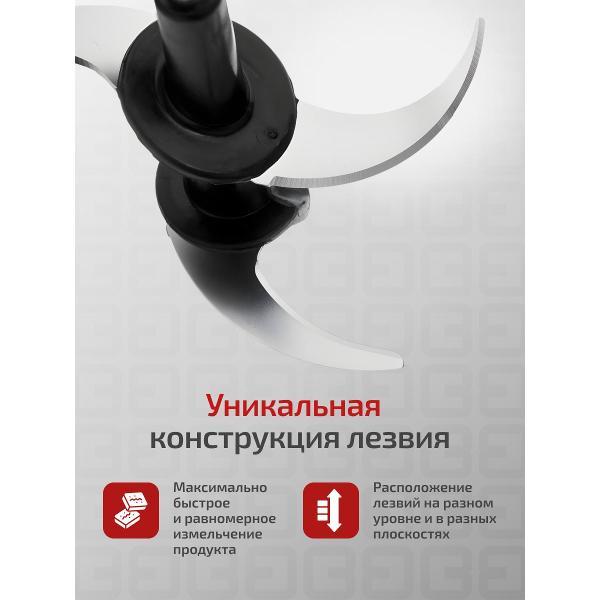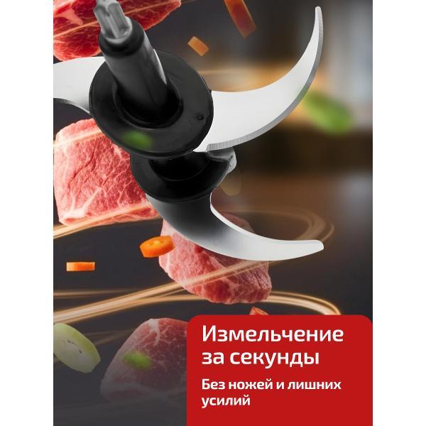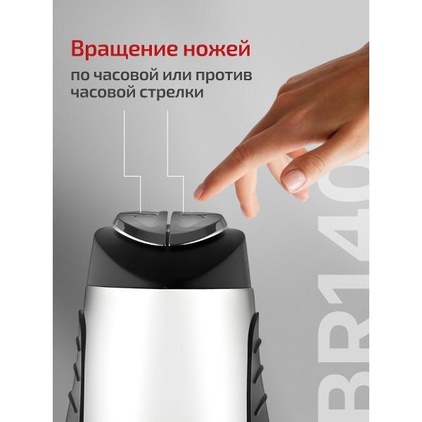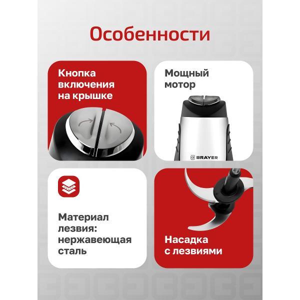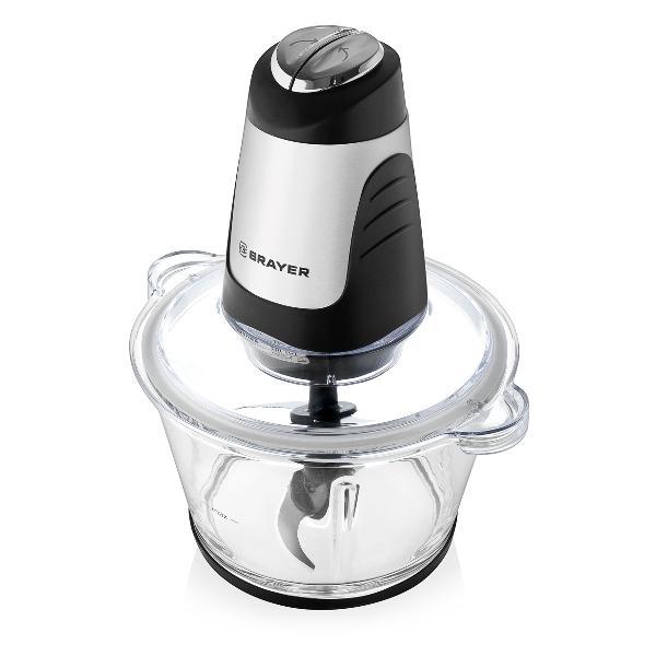 Электрический измельчитель Brayer BR1404 работает от двигателя мощностью 500 Вт и использует четыре стальных ножа для измельчения продуктов. Корпус устройства стальной, оснащен двумя кнопками управления на крышке. Для загрузки продуктов используется стеклянная чаша объемом 2 л. Измельчитель комплектуется лопаткой для перемешивания и антивибрационным ковриком.