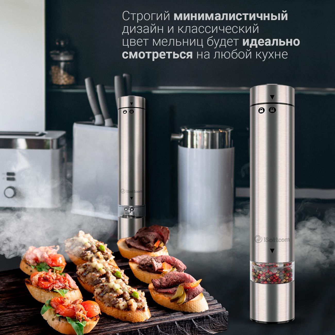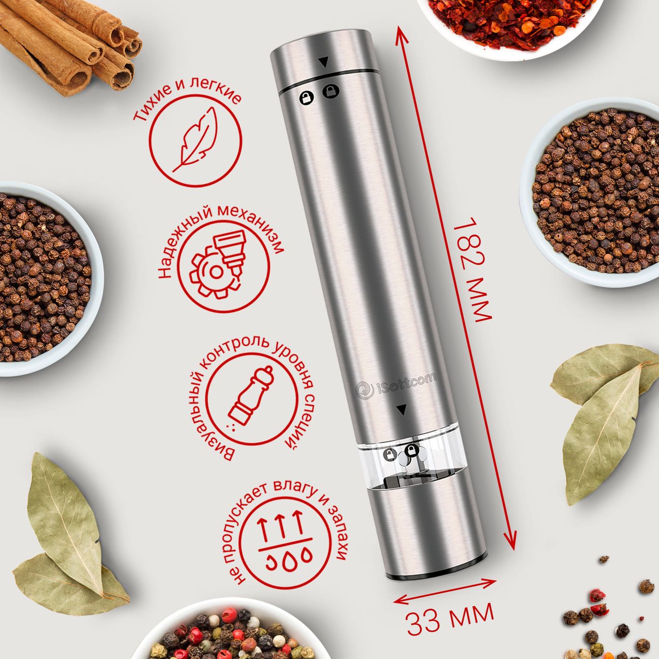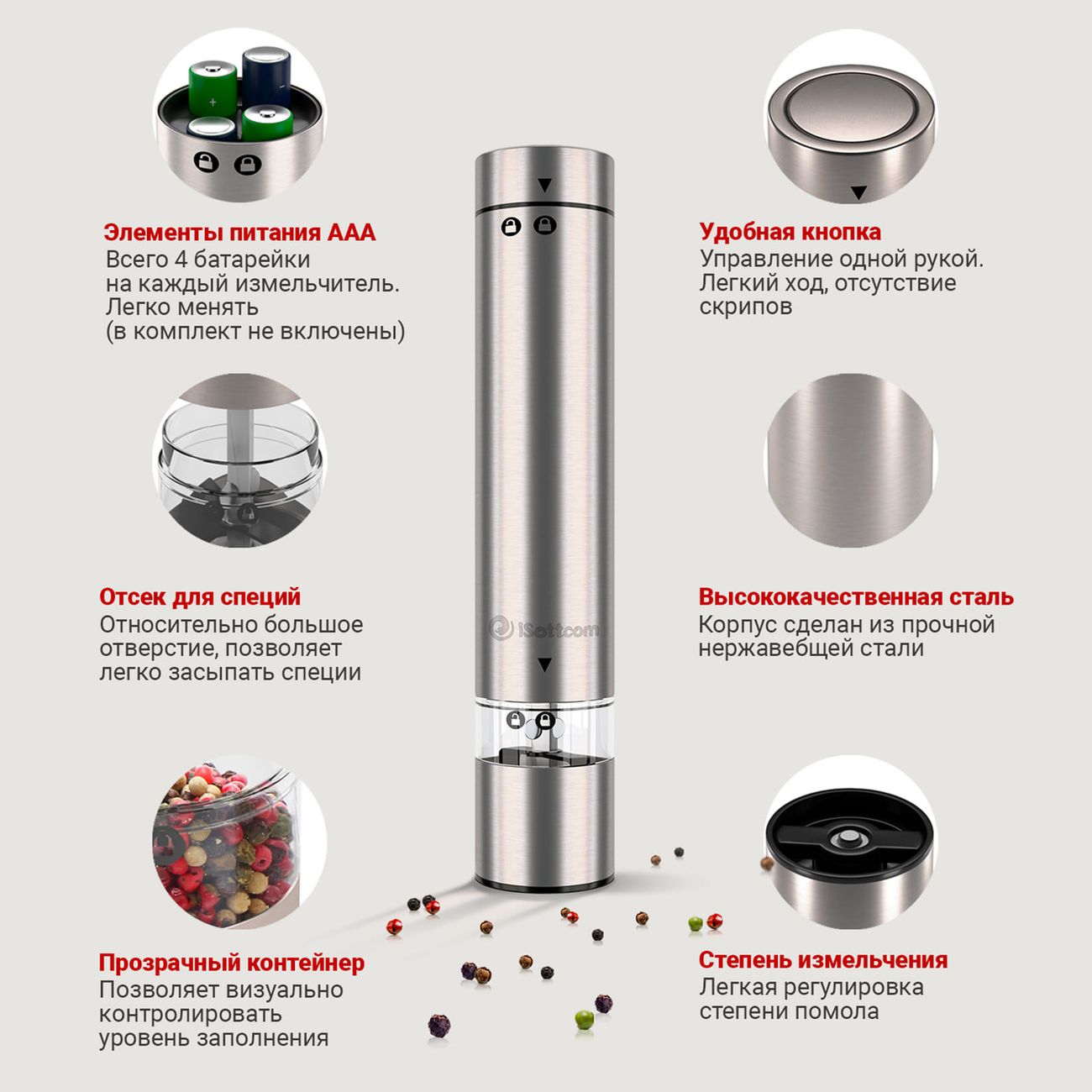 Электромельнички iSottcom Set 9556 в современном дизайне в цвете «Серебристый металлик» поставляются две в комплекте. Модели предназначены для измельчения специй. Питаются от четырех батареек типа ААА (одна мельница). Мощность составляет 18 Вт.