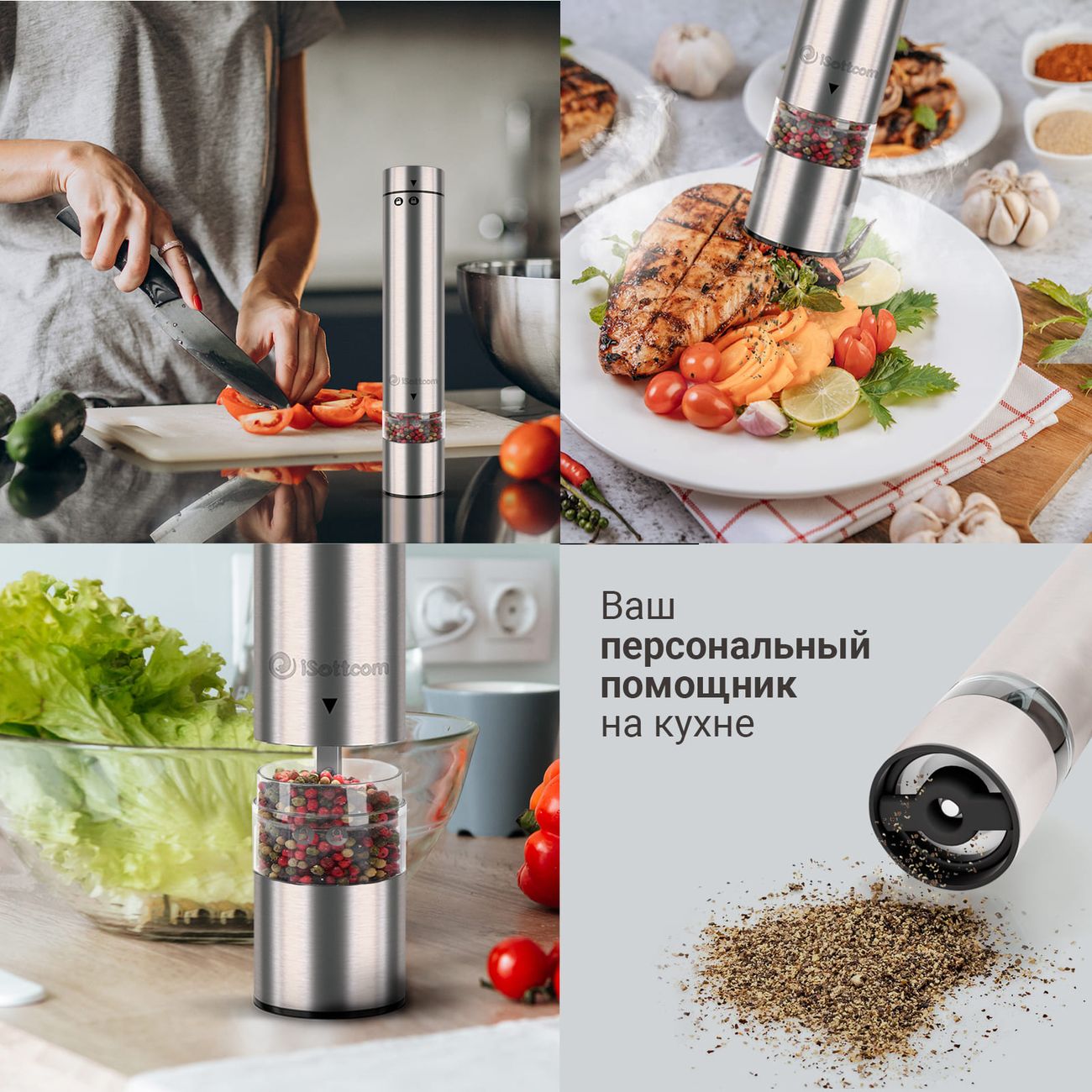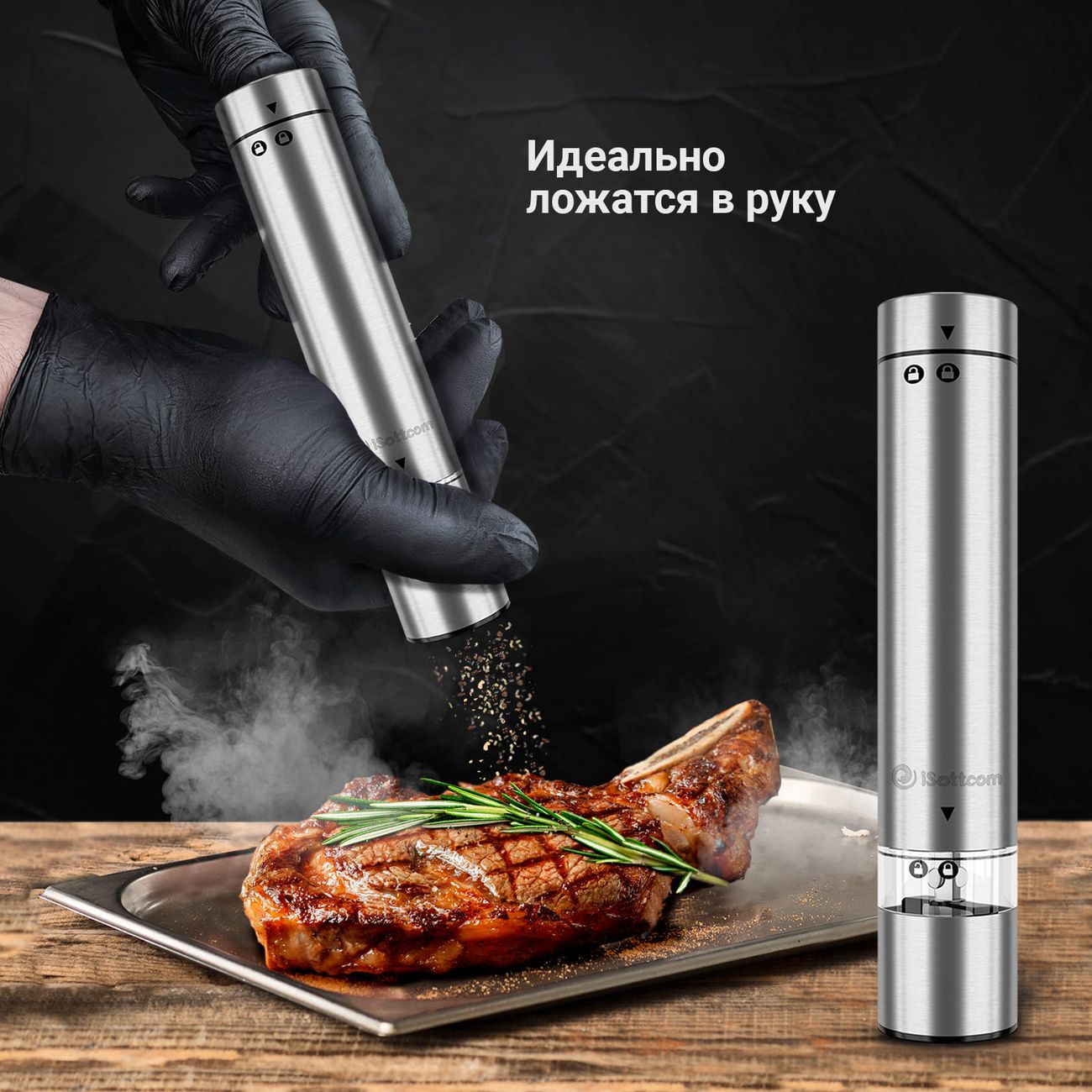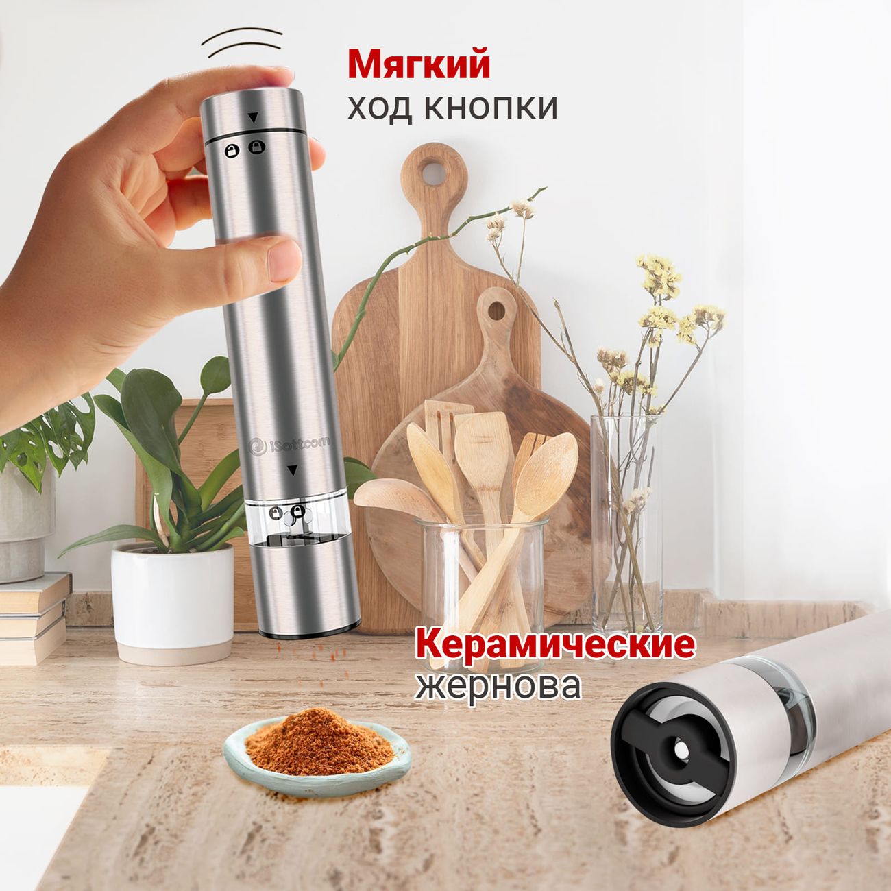 Электромельнички iSottcom Set 9556 в современном дизайне в цвете «Серебристый металлик» поставляются две в комплекте. Модели предназначены для измельчения специй. Питаются от четырех батареек типа ААА (одна мельница). Мощность составляет 18 Вт.