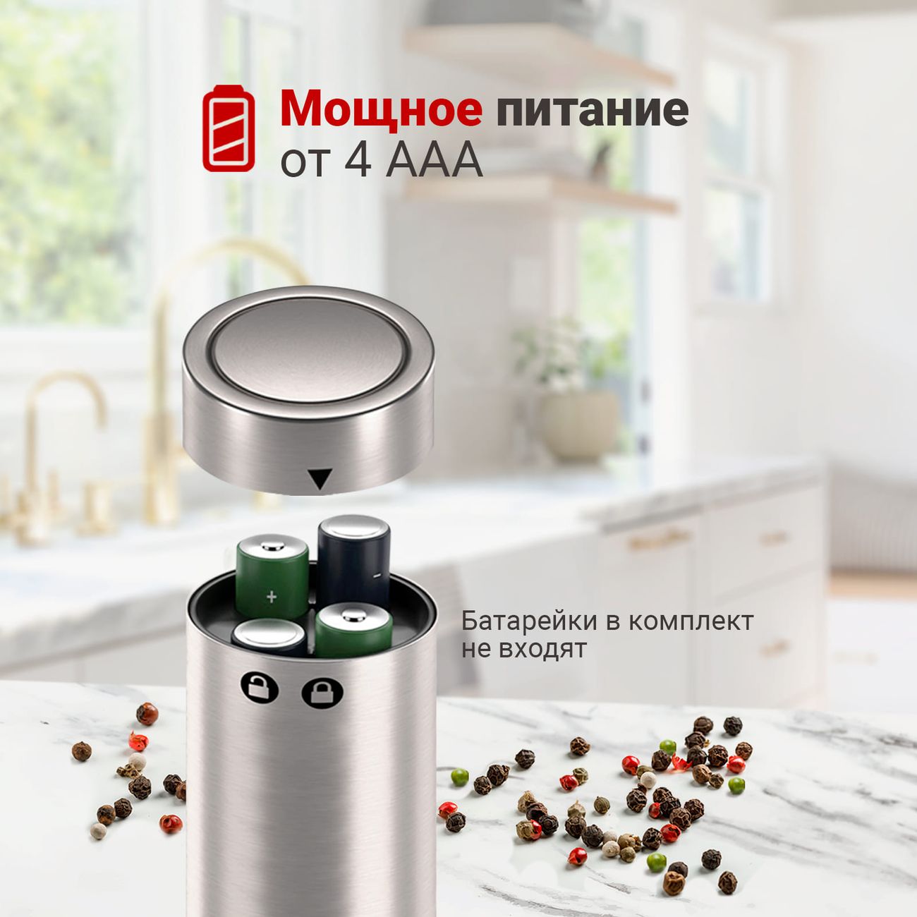 Корпус из алюминия и нержавеющей стали оснащен удобной кнопкой, одно нажатие на которую приводит в действие керамический механизм жерновов. Доступна регулировка степени помола.