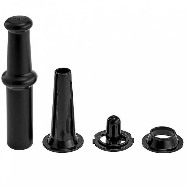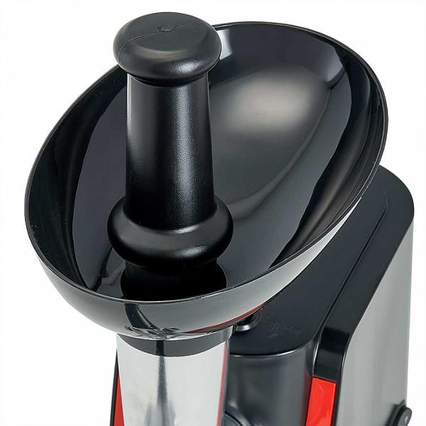 Толкатель пригодится для удобства перемещения продуктов из лотка во втулку. Управление осуществляется с помощью механической кнопки. Для очищения корпуса достаточно влажной салфетки. Чтобы помыть все съемные детали, потребуется моющее средство и губка.