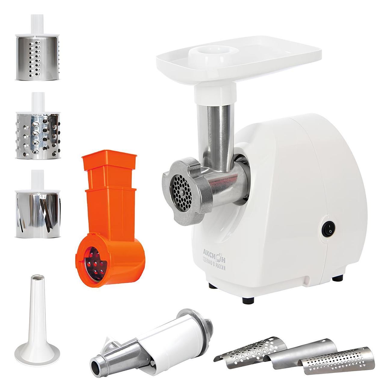 Электромясорубка «Аксион» М 21.02 мощностью 1000 Вт способна выдавать до 0,83 кг фарша в минуту, обеспечивая быструю и качественную обработку мяса. Особенностью модели считается полностью разборная камера, что облегчает процесс чистки и обслуживания. В комплект поставки входят три дополнительные насадки. Корпус выполнен из пластика, установлены прорезиненные ножки для более надежной фиксации на столе.