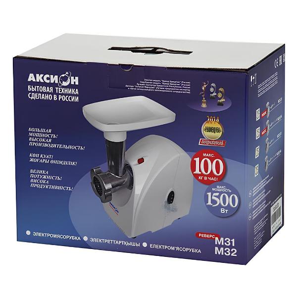 Электромясорубка «Аксион» М 32.02 мощностью 1500 Вт способна выдавать до 1,7 кг фарша в минуту, обеспечивая быструю и качественную обработку мяса. Особенностью модели считается полностью разборная камера, что облегчает процесс чистки и обслуживания. В комплект поставки входят три дополнительные насадки. Корпус выполнен из пластика, установлены прорезиненные ножки для более надежной фиксации на столе.