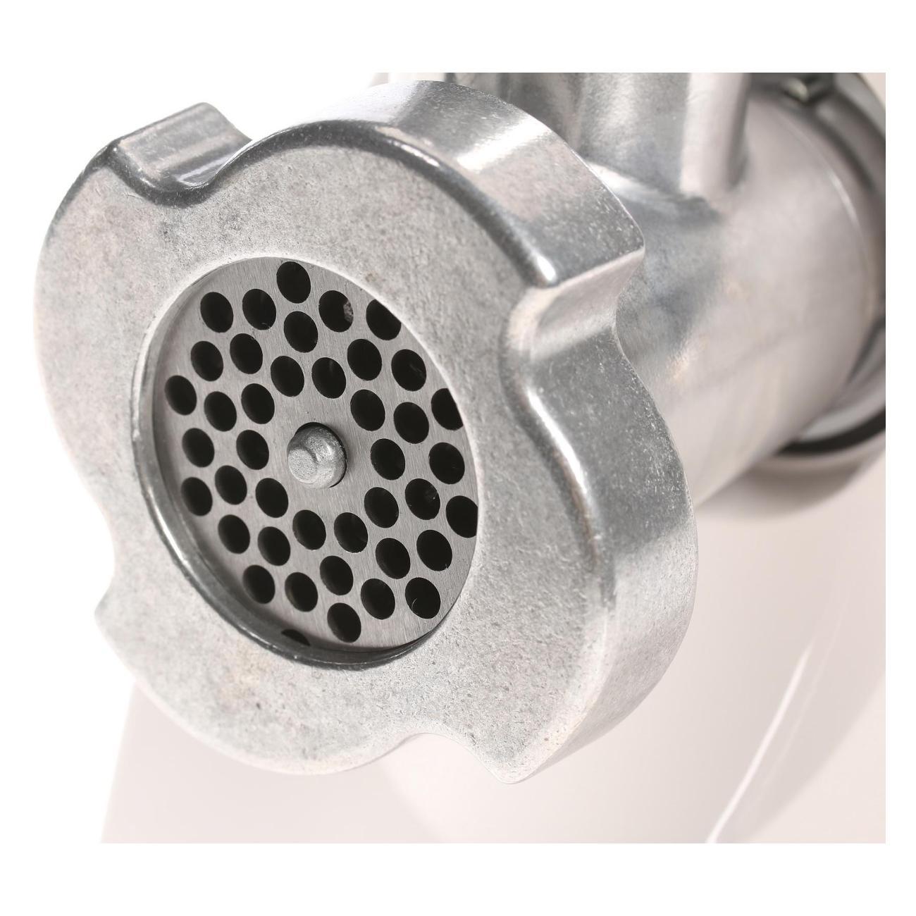 Включение-выключение осуществляется при помощи механической клавиши, встроенной на боковой панели. Корпус изготовлен из пластика белого цвета, дополнен отсеком для компактного хранения насадок. При перегреве мясорубка выключается автоматически. Шнек и нож выполнены из нержавеющей стали. Габариты — 32х17х26 см. Вес — 4 кг.
