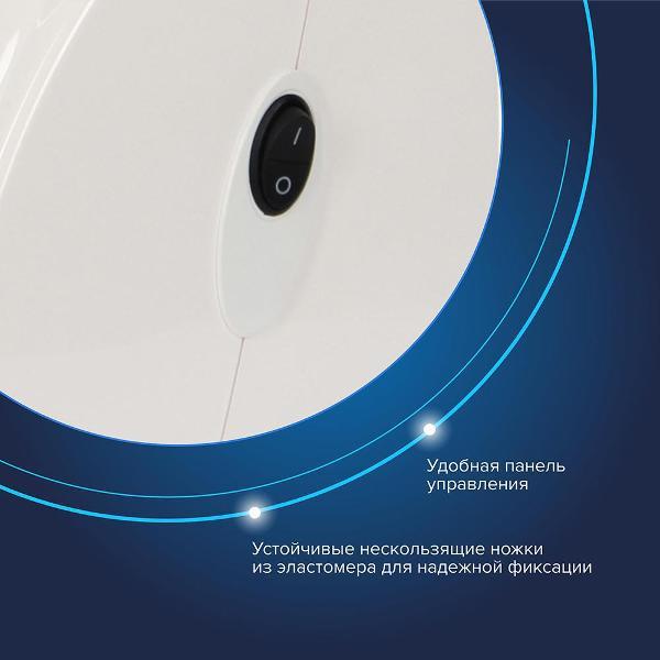 Включение-выключение осуществляется при помощи механической клавиши, встроенной на боковой панели. Корпус изготовлен из пластика белого цвета, дополнен отсеком для компактного хранения насадок. При перегреве мясорубка выключается автоматически. Шнек и нож выполнены из нержавеющей стали. Габариты — 32х17х26 см. Вес — 4 кг.