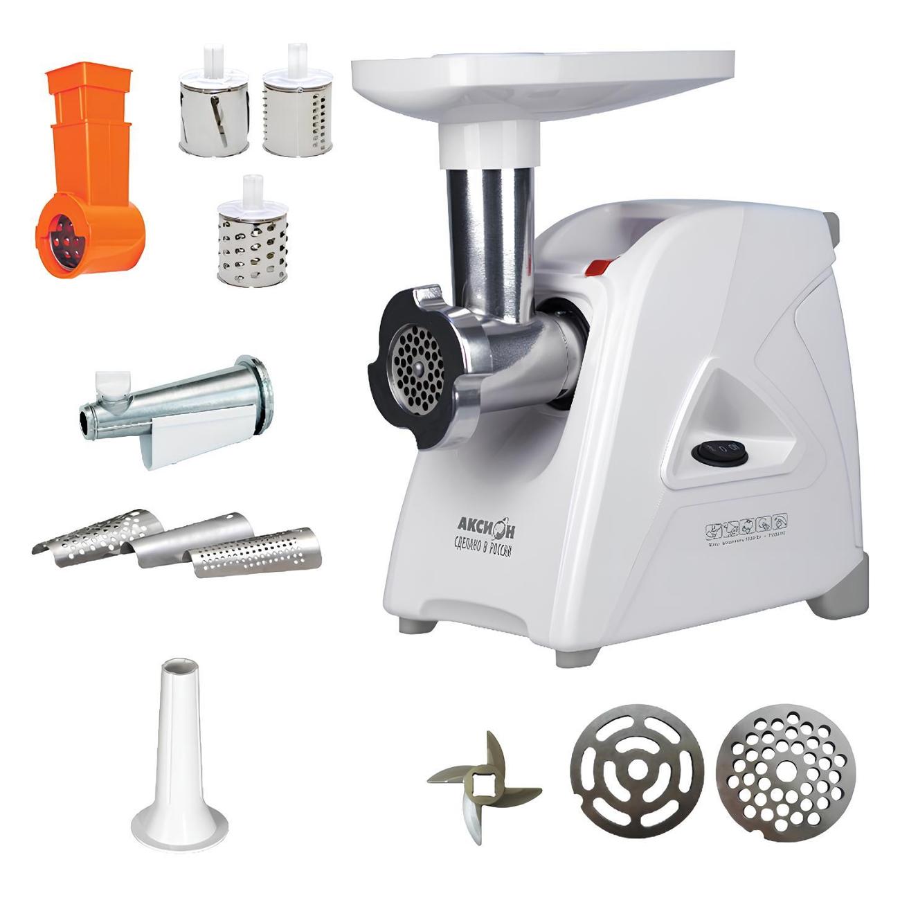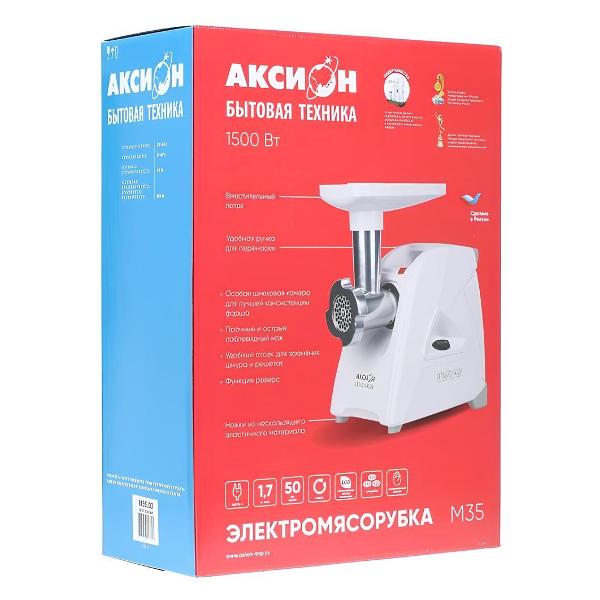 Электромясорубка «Аксион» М 35.02 в корпусе белого цвета обладает полностью разборной камерой, обеспечивающий полную и качественную очистку после использования. Производительность составляет до 1,7 кг фарша в минуту. Для переключения со скорости на реверс применяется механическая клавиша. Предельный уровень шума во время эксплуатации — 82 дБ.