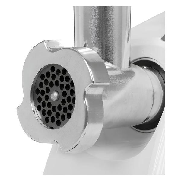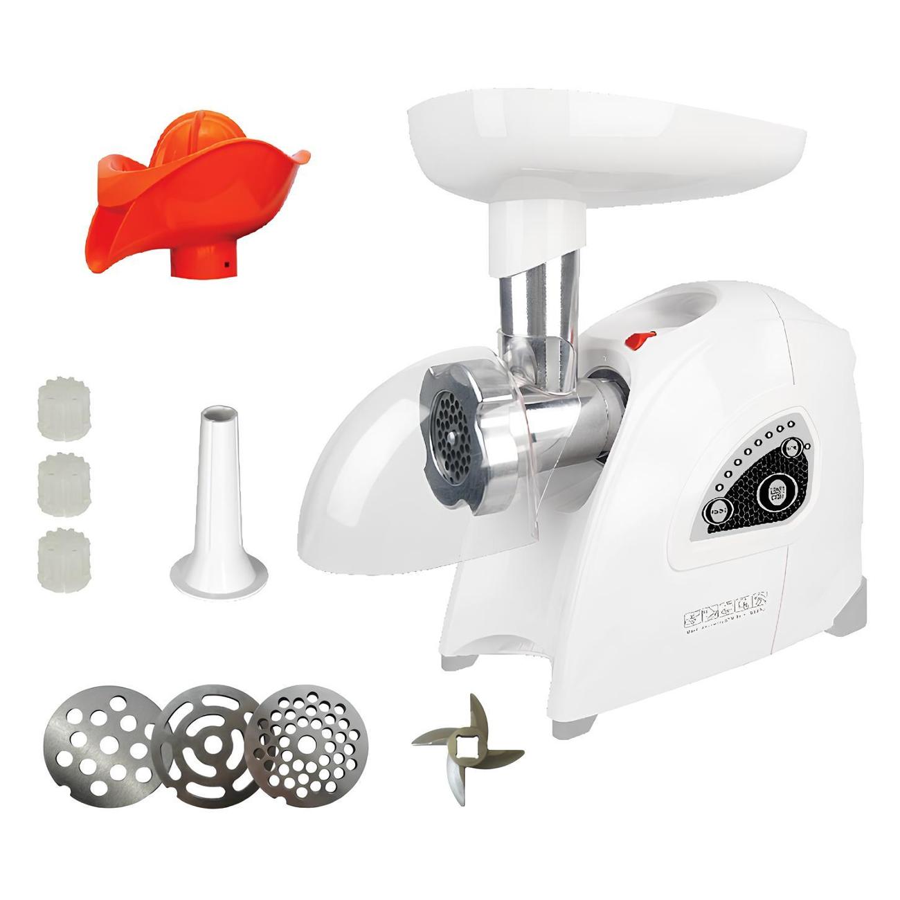 Две насадки, кожух для защиты от брызг и пластиковая крышка-лоток входят в комплект поставки. Основание дополнено прорезиненными ножками, предотвращающими скольжение по поверхности стола. При перегреве происходит автоматическое выключение. Материалы изготовления съемного ножа и шнека — сталь и алюминий соответственно. Корпус окрашен в белый цвет. Габариты — 16,9х24,2х25,5 см. Вес — 4,7 кг.