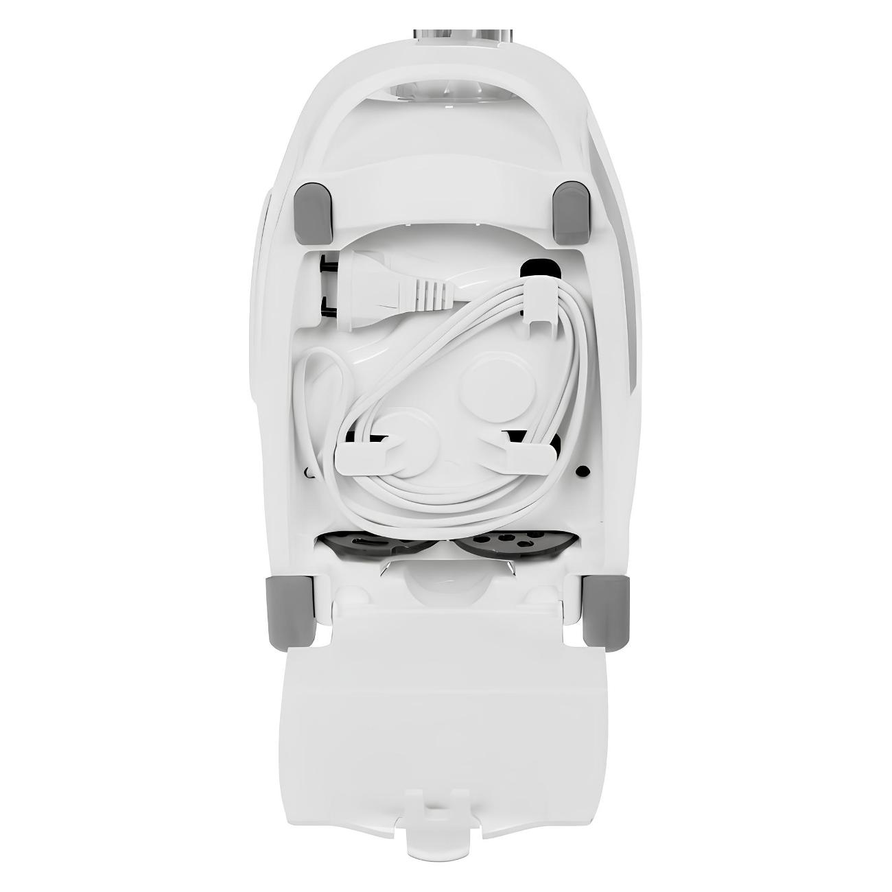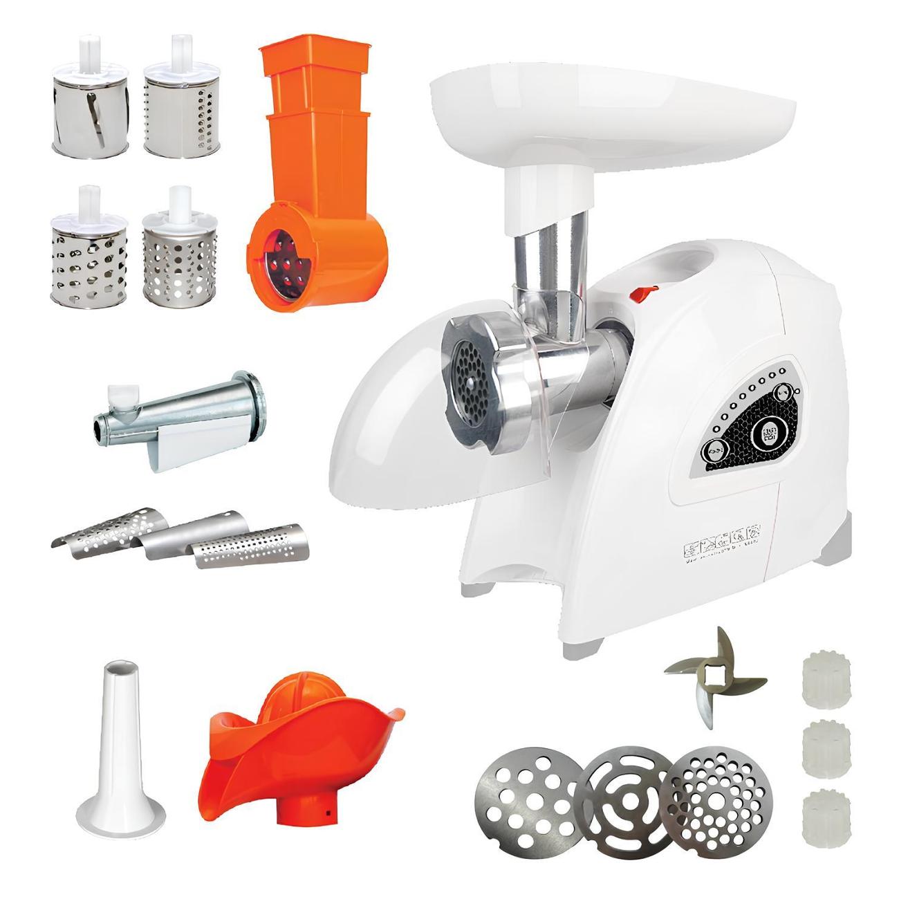 Комплектация: кожух, защищающий от брызг, крышка-лоток и четыре насадки, которые можно убрать в специальный отсек в корпусе. Стальной нож легко снимается для очистки. Камера — разборная. При перегреве отключение происходит автоматически. Шнек изготовлен из алюминия. Цвет — белый. Габариты — 16,9х24,2х25,5 см. Вес — 5,7 кг.