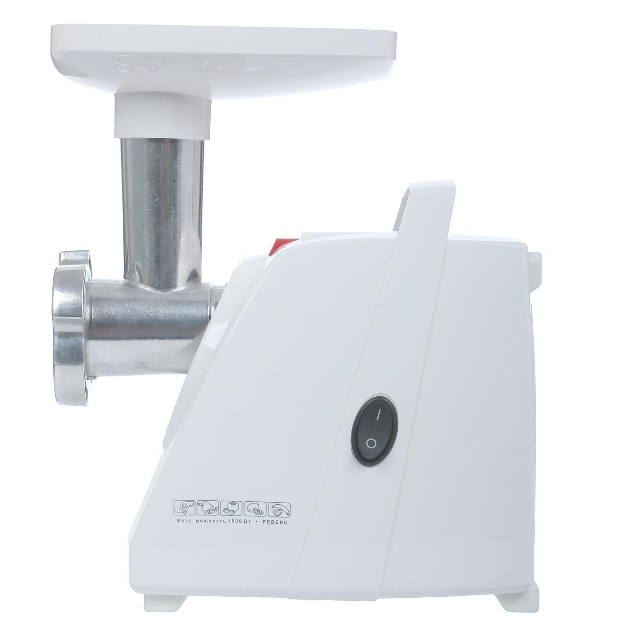 В комплекте: базовая насадка для приготовления фарша, решётка с диаметром отверстий 4.9 мм, насадка-овощерезка, пластиковый лоток и толкатель.