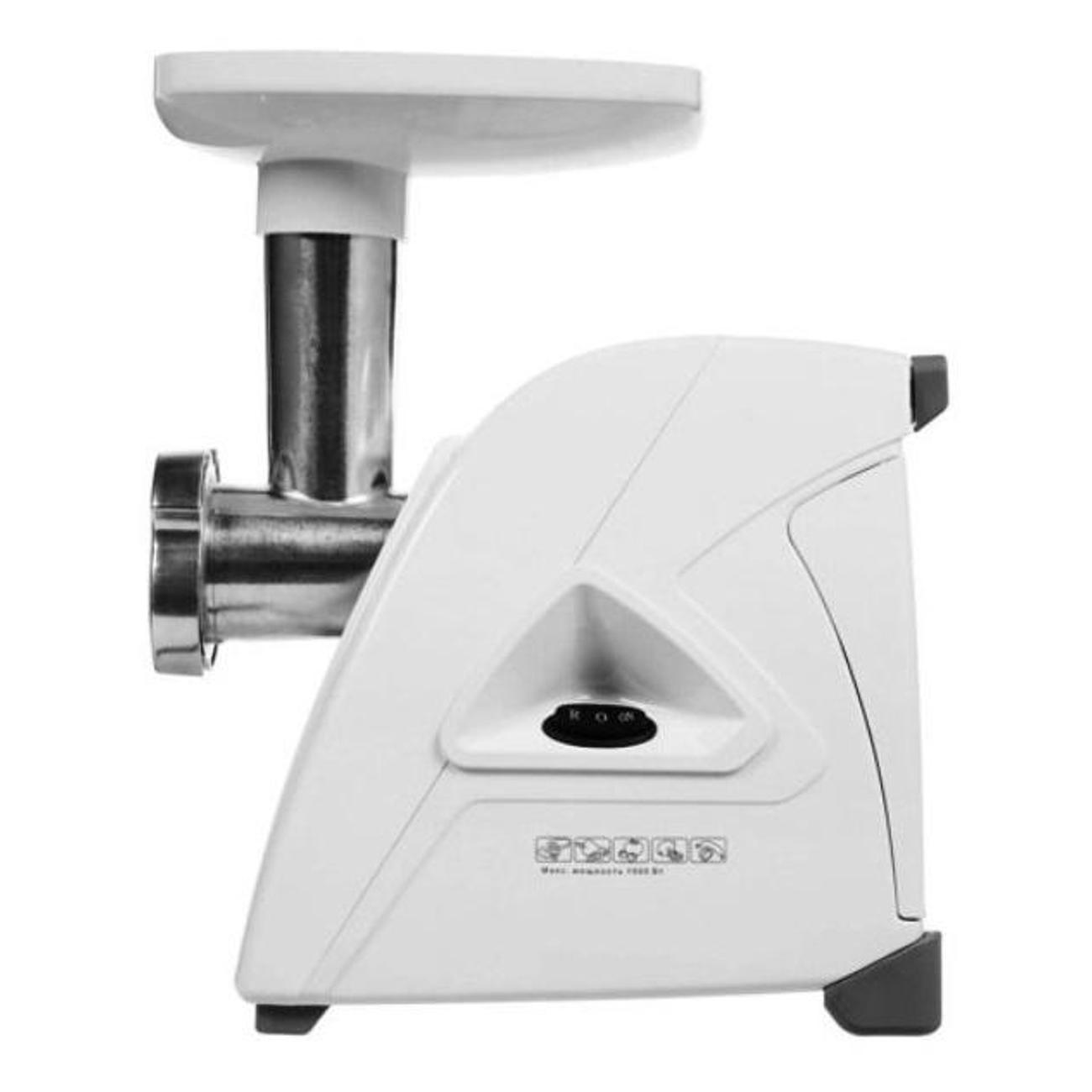 В комплекте: базовая насадка для приготовления фарша, решётка с диаметром отверстий 4.9 мм, пластиковый лоток и толкатель.