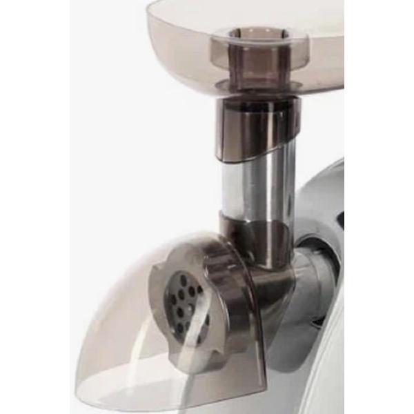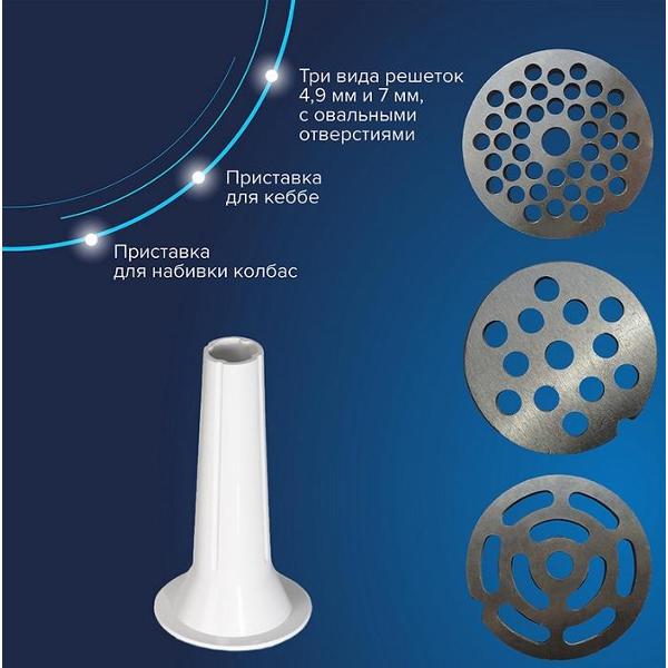 Электромясорубка «Аксион» М41.00 серого цвета идет в комплекте с кожухом для защиты от брызг. Устройство автоматически отключается при перегревании и при попадании твердых частиц. Съемный нож сделал из стали с антикоррозийными свойствами. Габариты модели — 25,5х16,9х24,2 см. Вес изделия — 4,5 кг. Пластиковый корпус оснащен отсеком для хранения насадок. Прорезиненные ножки не скользят по поверхности. Уровень шума не превышает 70 дБ. Производительность прибора — 2 кг/мин. Мощность при блокировке мотора — 2,5 кВт.