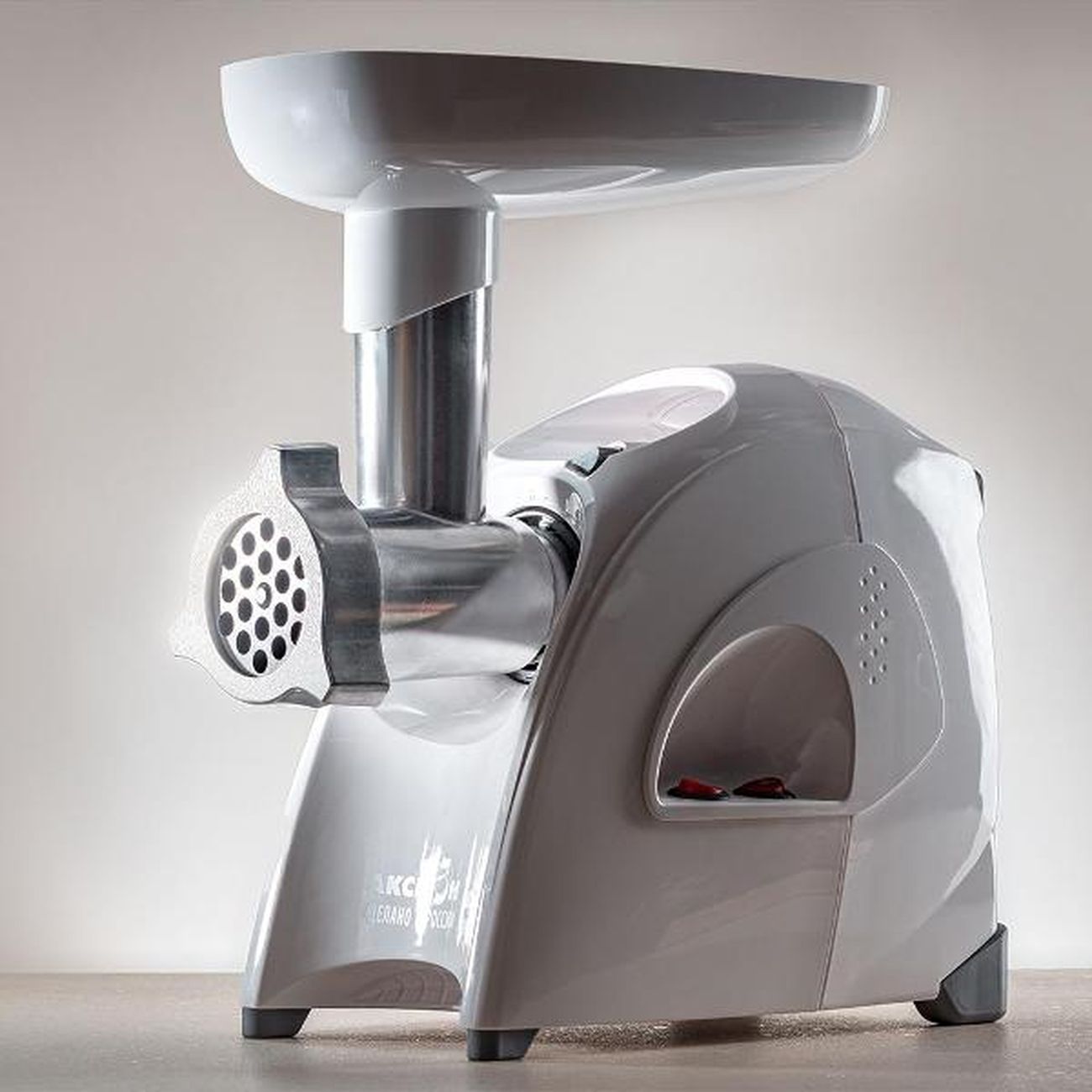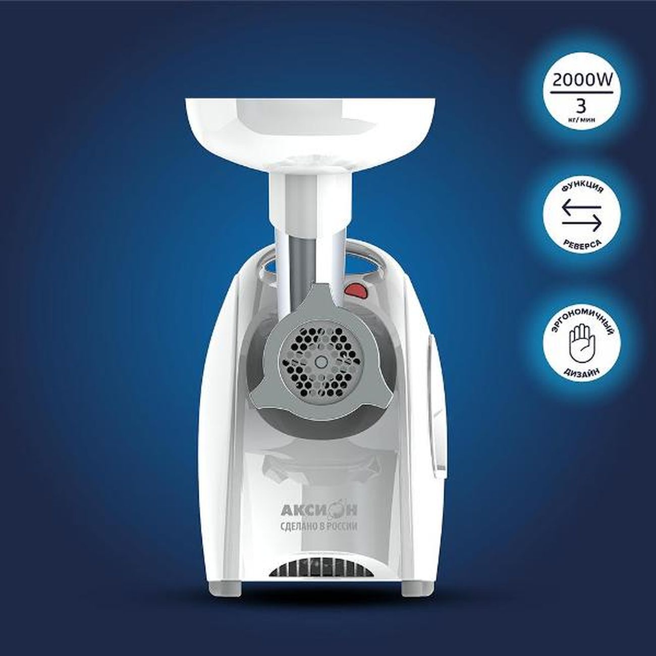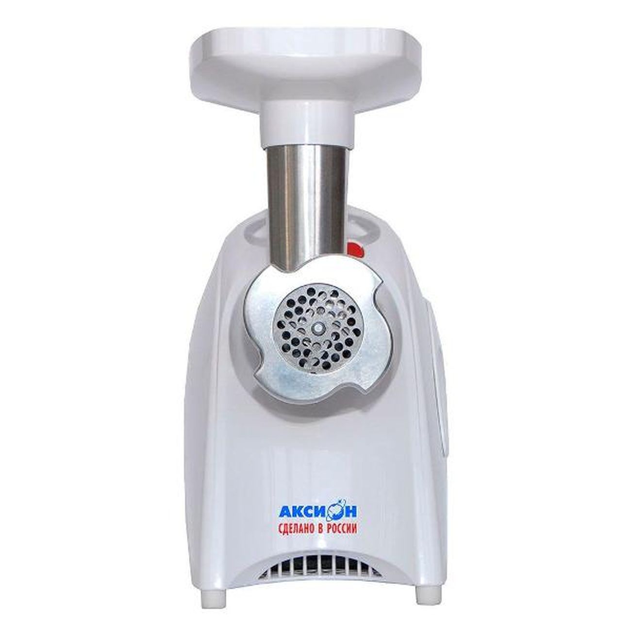 Электромясорубка «Аксион» М41.04 позволяет готовить до 2 кг фарша за одну минуту. Номинальная мощность составляет 260 Вт, предельный уровень шума — 76 дБ. Управление скоростями и реверсом реализуется посредством механической клавиши, размещенной на боковой панели. Комплект поставки состоит из семи насадок, в том числе для приготовления колбасы.
