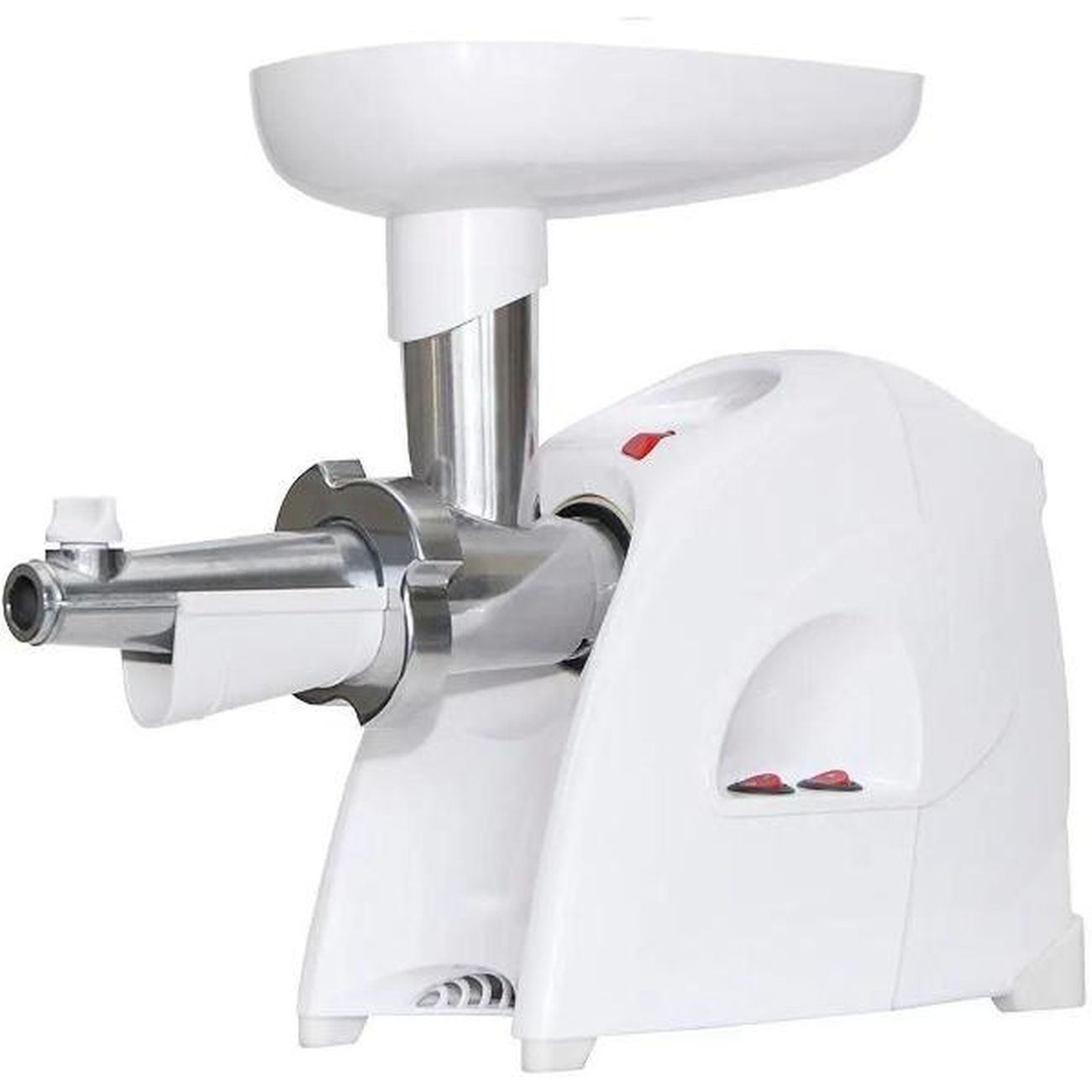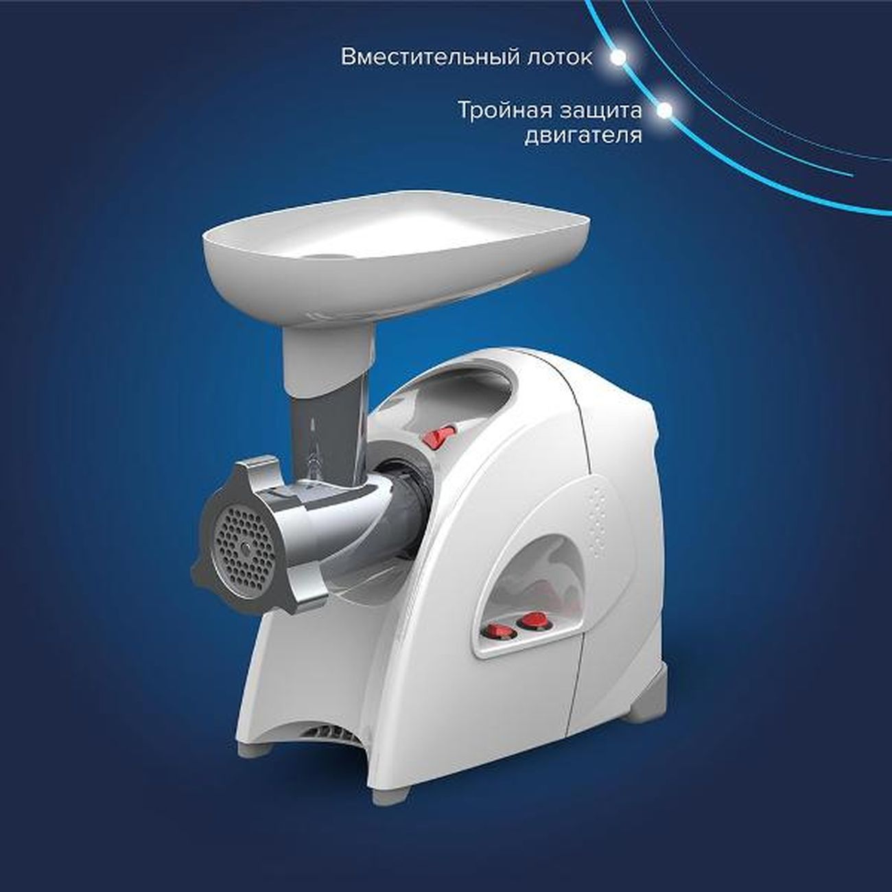 Кожух исключает разлетание продуктов во время работы. Функция самостоятельного выключения защищает двигатель от перегрева. Ножки с прорезиненными накладками придают устойчивость и не позволяют устройству двигаться. Ручка-выемка упрощает переноску. Нож и шнек выполнены из нержавеющей стали, корпус — из пластика белого цвета. Габариты — 31,9х17х26,8 см. Вес — 4,5 кг.
