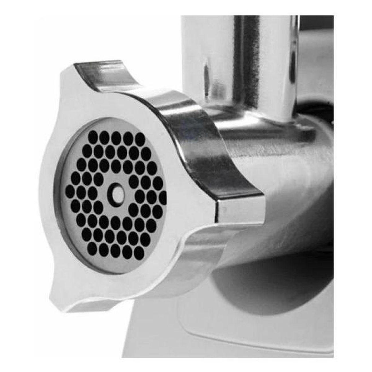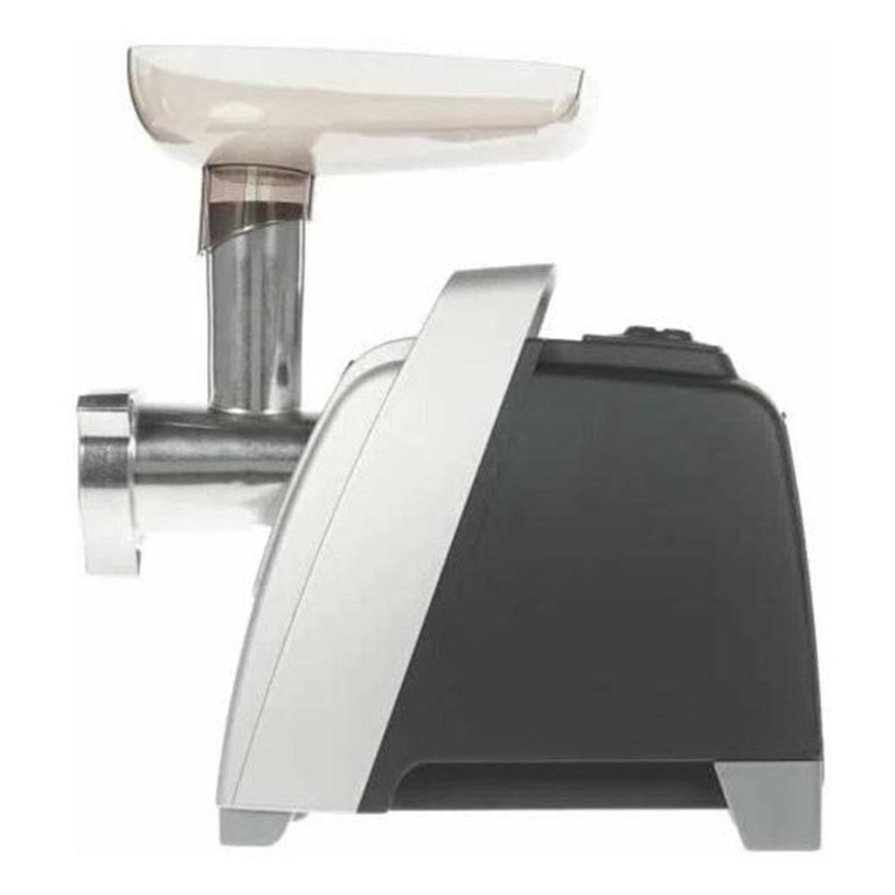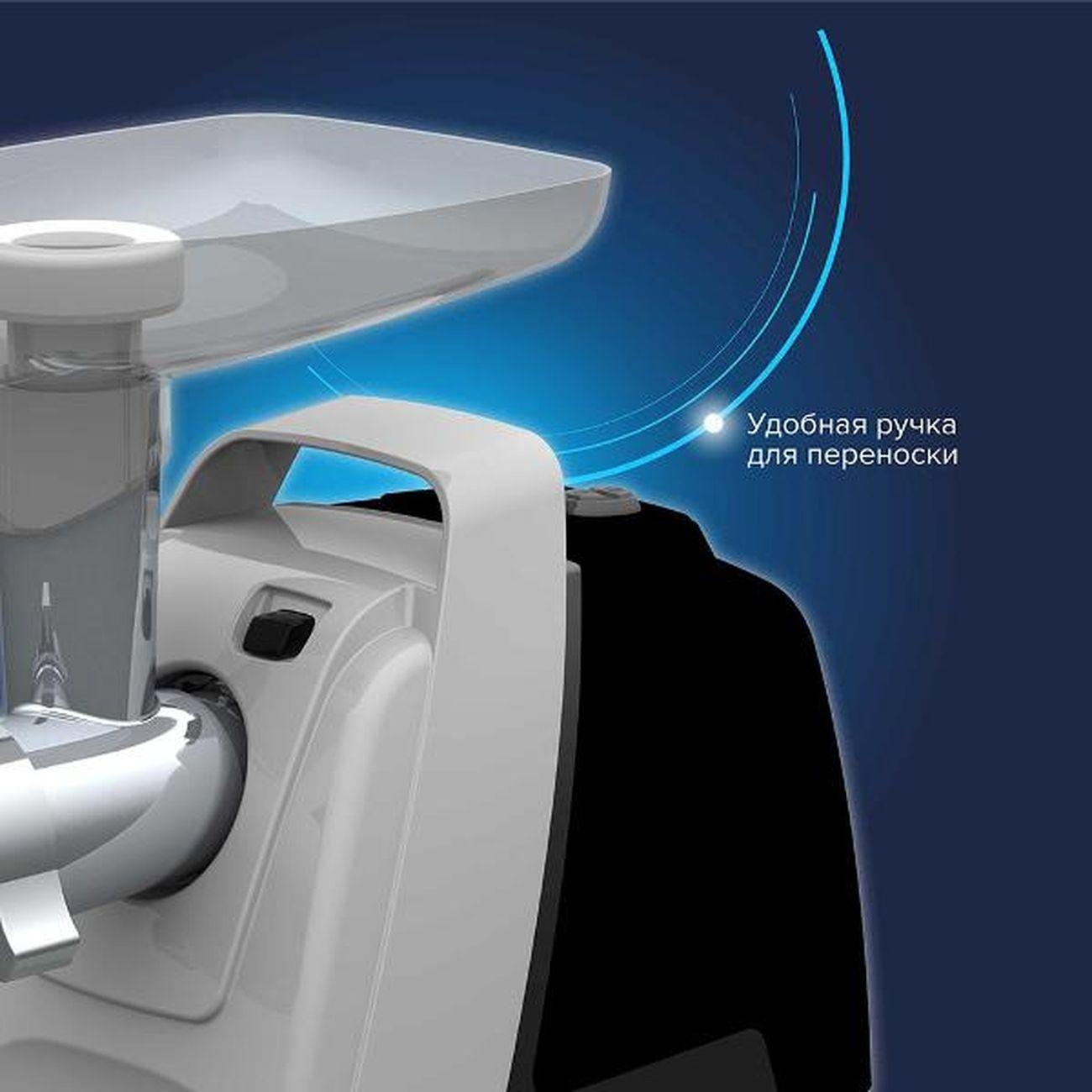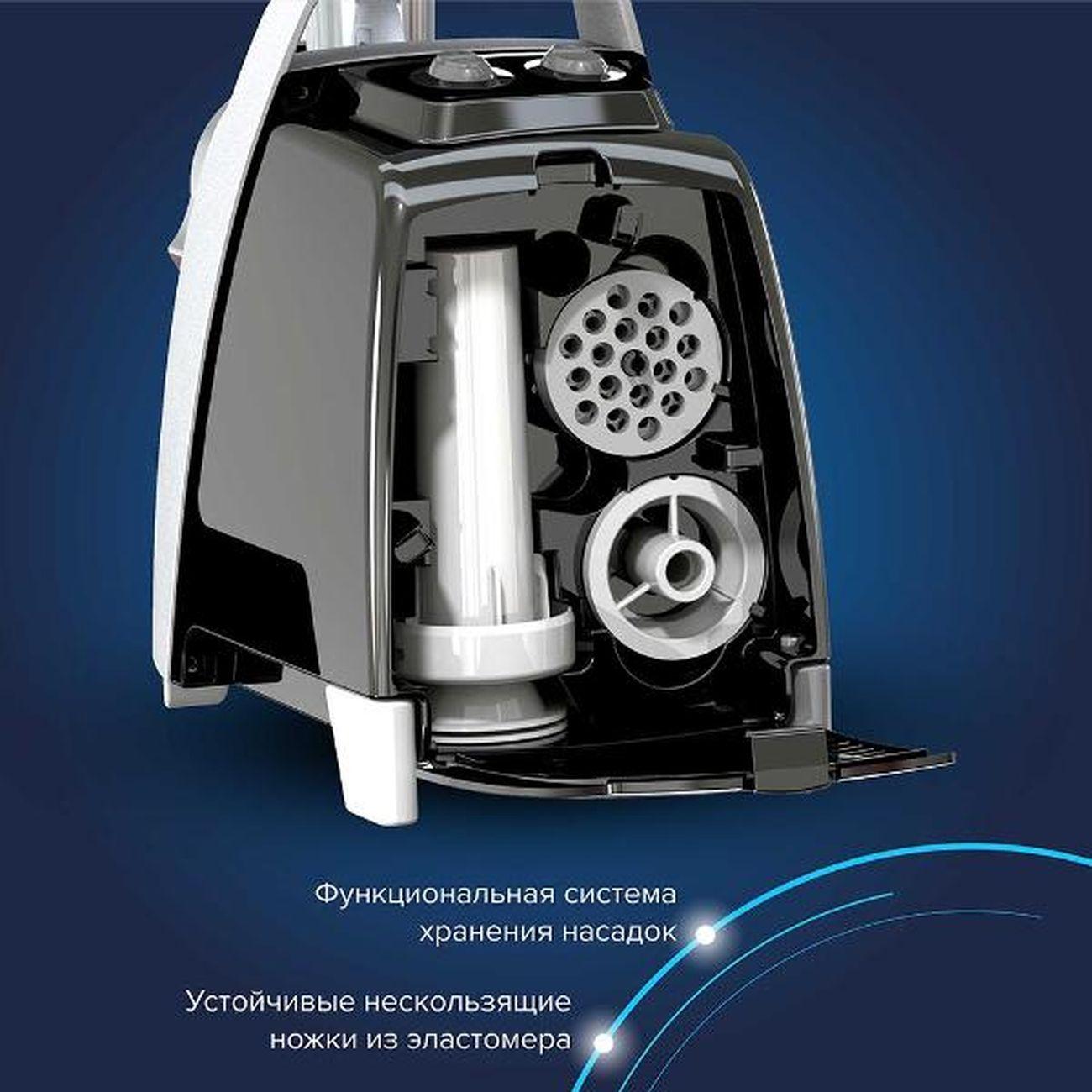 Для хранения шнура длиной 1,5 м в конструкции прибора предусмотрен специальный отсек. Прорезиненные ножки исключают скольжение по поверхности столешницы. Шнек и острые ножи произведены из нержавеющей стали. Небольшая рукоятка упрощает процесс перемещения мясорубки с одной части помещения в другую. В случае возникновения перегрева срабатывает автоматическое отключение. В набор входит толкатель для удобной и безопасной работы. Благодаря компактным габаритным размерам (28,4х18,4х23,4 см) устройство не занимает много места на столе.