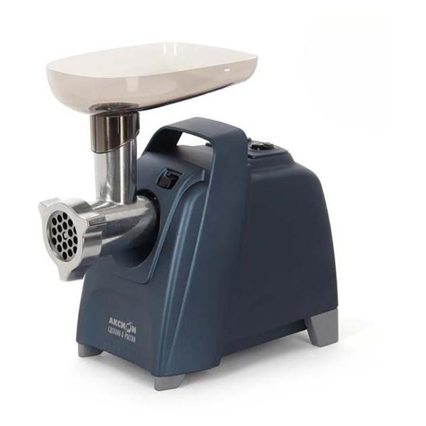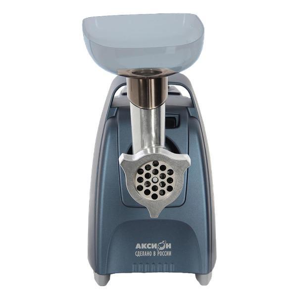 Электромясорубка «Аксион» М61.03 в пластиковом корпусе синего цвета дополнена ручкой для удобства транспортировки. Номинальная мощность составляет 300 Вт, при блокировке мотора — 2000 Вт. Модель обеспечивает приготовление до 4 кг фарша в минуту. Модель оснащена двумя клавишами - для включения скорости и реверс для обратного хода.