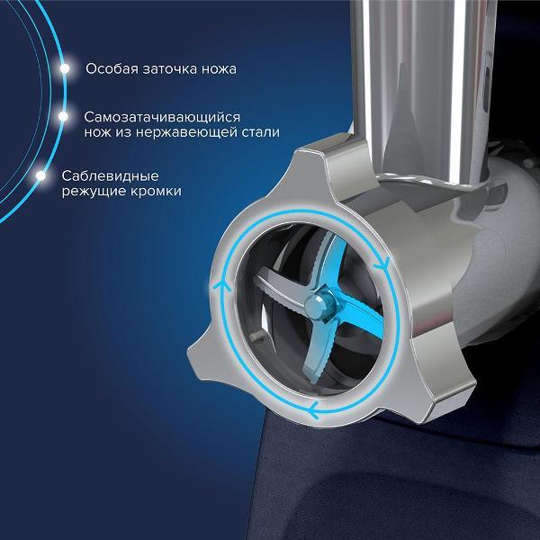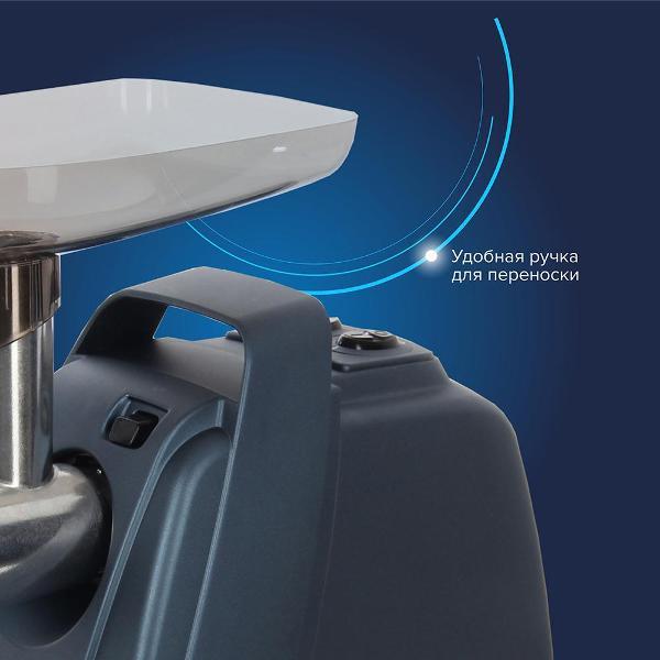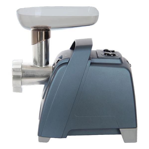 На тыльной стороне размещен отсек для хранения сетевого кабеля. Две насадки – базовая для приготовления фарша с решёткой, с диаметром отверстий 4.9 мм, насадка-овощерезка и крышка-лоток входят в комплект поставки. Основание дополнено ножками с прорезиненными накладками, препятствующими скольжению. Защиту от перегрева двигателя гарантирует автоматическое выключение. Шнек и съемный нож изготовлены из нержавеющей стали. Габариты — 18,4х28,4х23,4 см. Вес — 4,8 кг.