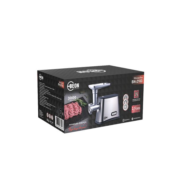 Электромясорубка Beon BN-2103 мощностью 1000 Вт предназначена для первичной обработки мяса или изготовления других блюд. С помощью модели можно переработать до 2,5 кг ингредиентов в минуту. Максимальный уровень шума устройства — 80 дБ. Для создания колбас в комплекте есть специальные насадки. Электромясорубка способна функционировать в течение длительного времени. Если произойдет перегрев двигателя, устройство автоматически отключится.