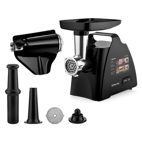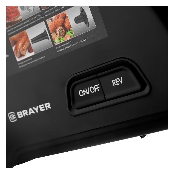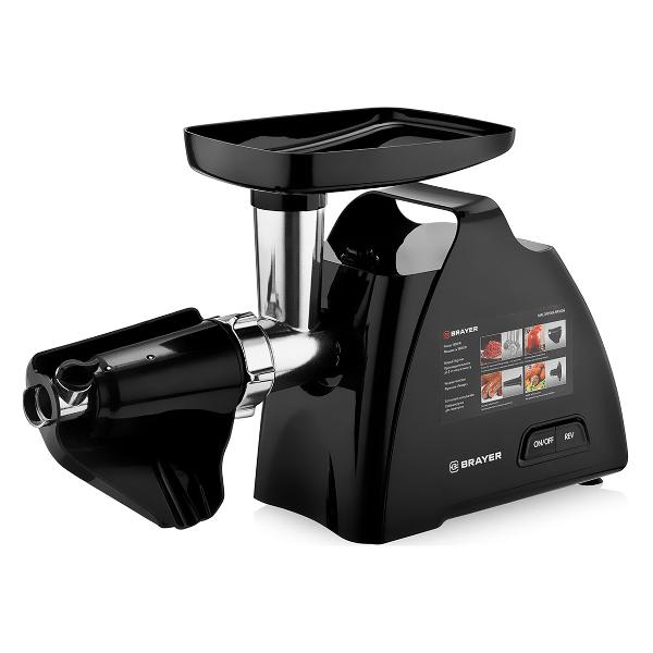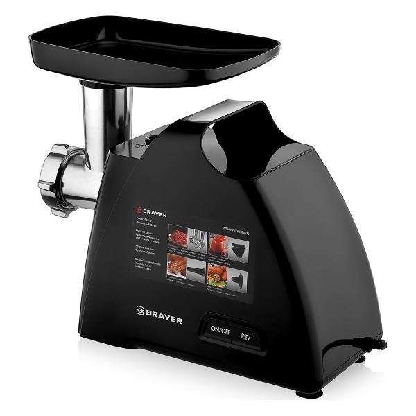 Электромясорубка Brayer 1606BR, черная, обладает массой 3,8 кг. В устройстве установлена система отключения при перегреве. Корпус выполнен из металла и пластика. Модель обладает полностью разборной камерой подачи мяса. У прибора съемная конструкция ножа. На дне размещаются прорезиненные ножки.