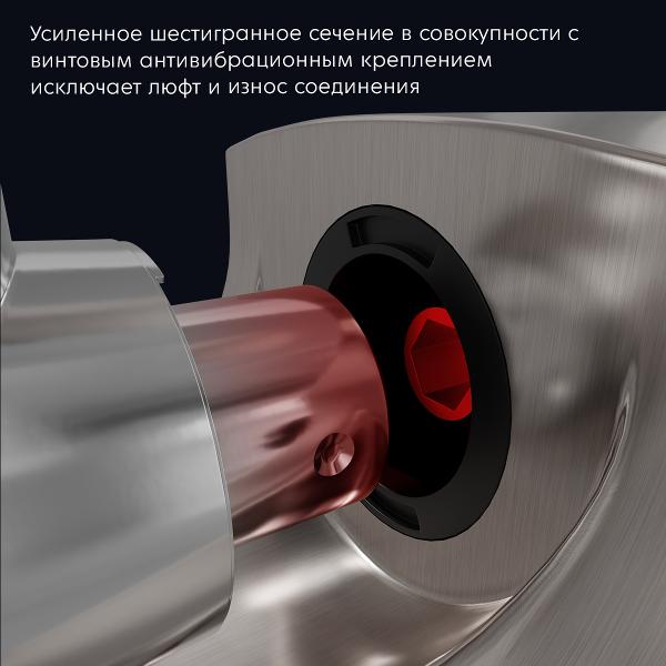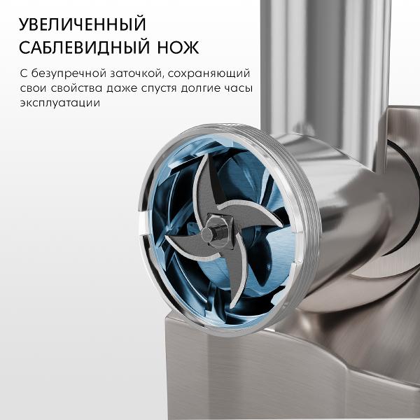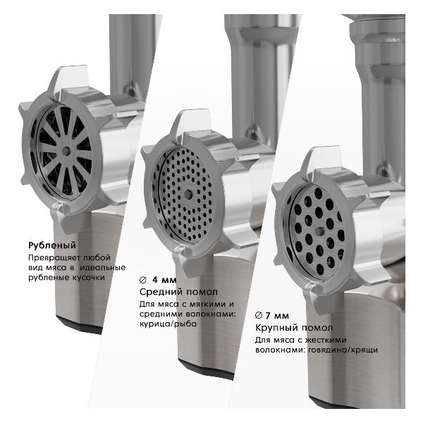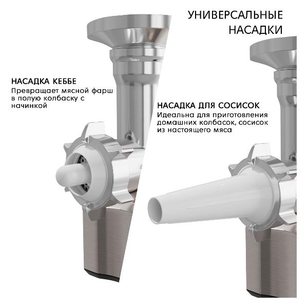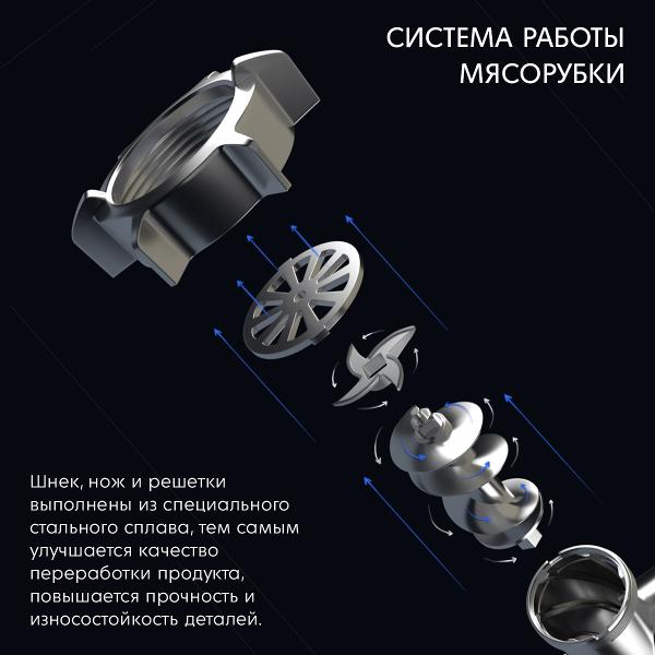 Камера для подачи мяса полностью разбирается, что облегчает чистку и мытье. В наборе поставляются две насадки. Устройство обеспечивает производительность до 2,5 кг/мин. Производитель предусмотрен автоотключение при попадании твердых частиц и перегреве, что увеличивает срок службы электроприбора.