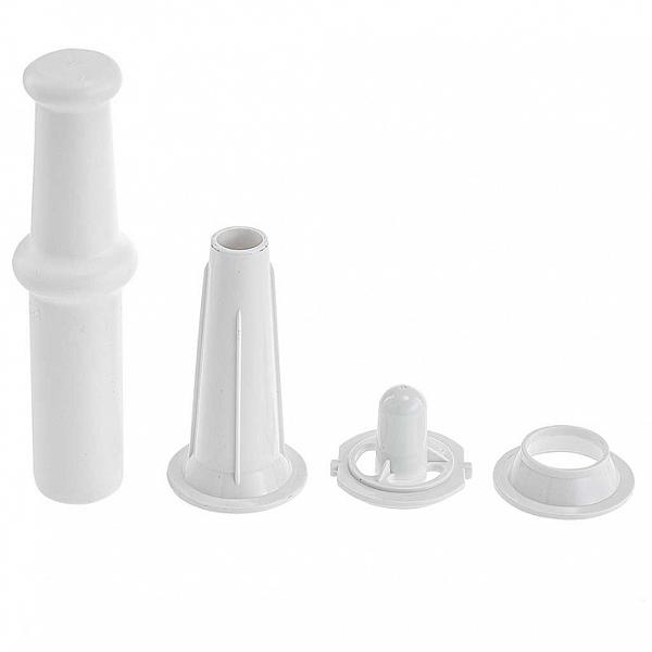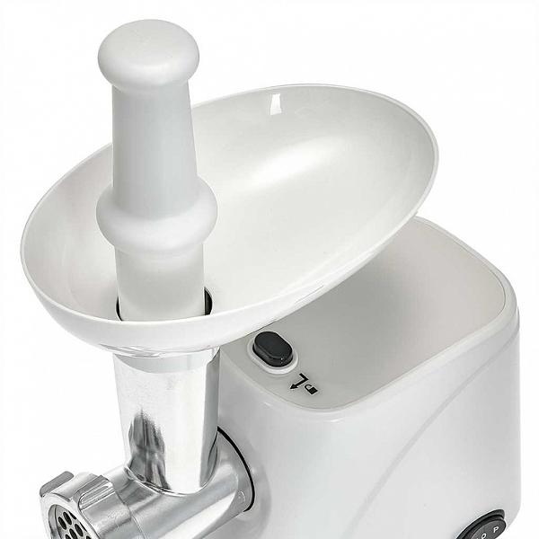 В комплекте есть две сменные решетки с отверстиями различного диаметра. Все режущие элементы изготовлены из износоустойчивого металла, который не подвержен образованию коррозии. Прорезиненные ножки обеспечивают надежную фиксацию прибора на столе во время использования и защищают устройство от соскальзывания. Корпус белого цвета.