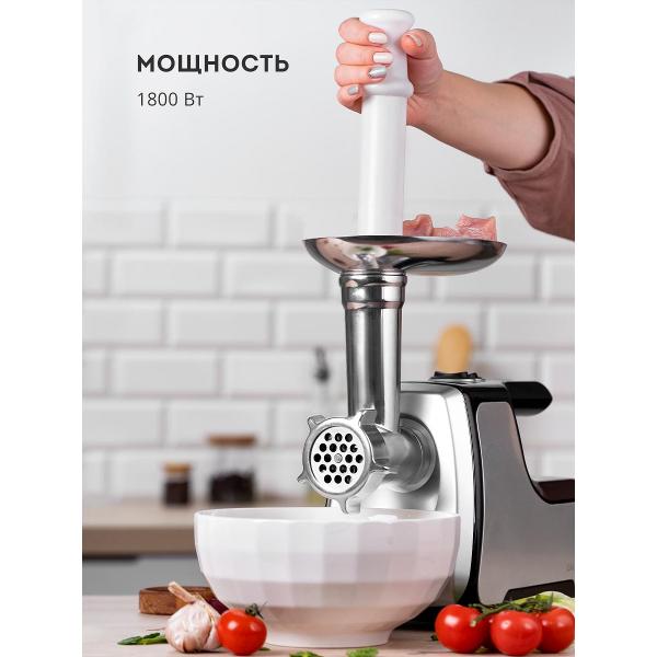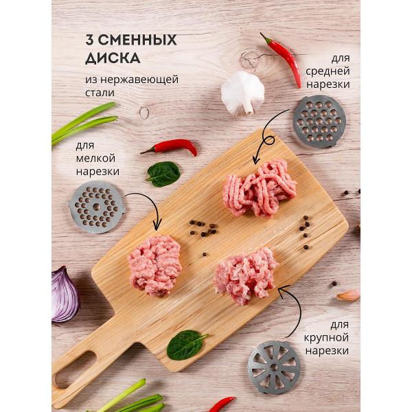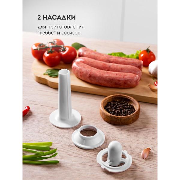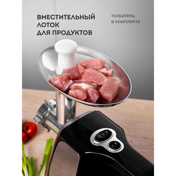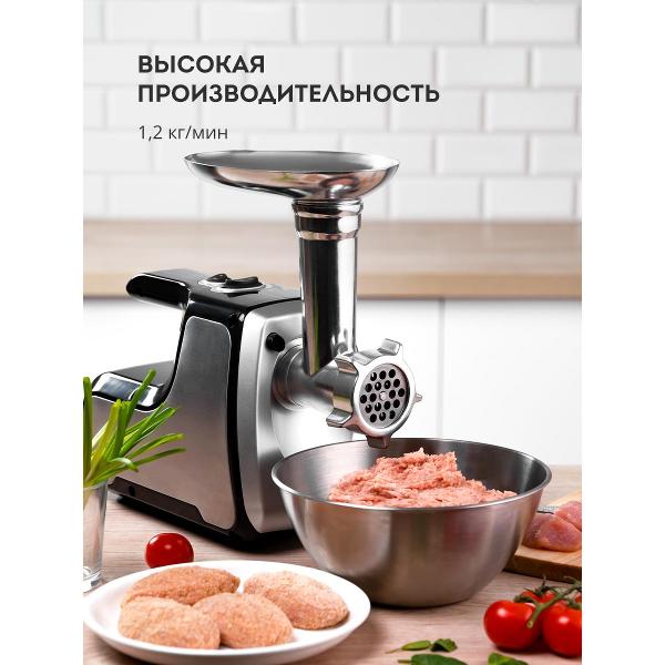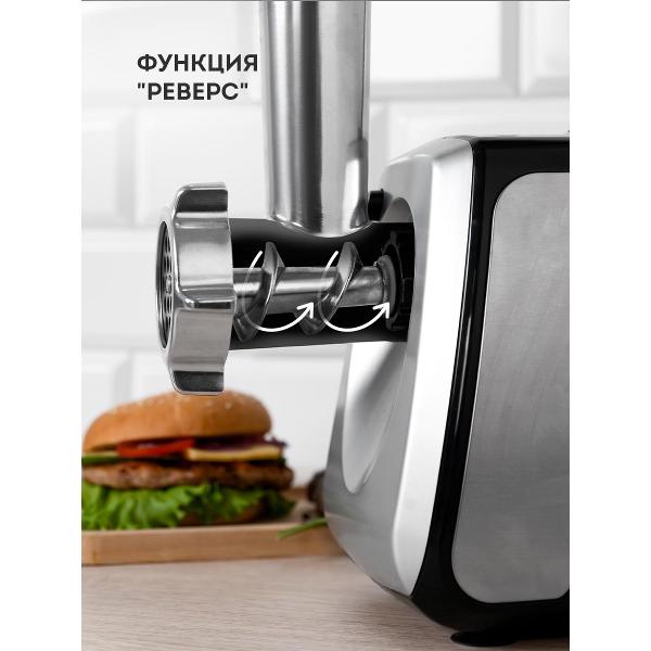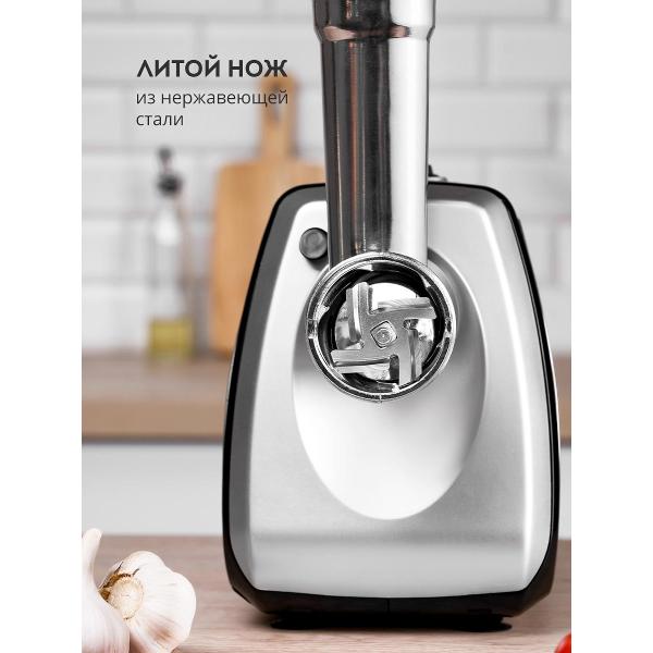 Доступна функция «Реверс», позволяющая быстро избавиться от застрявших кусочков жира и мяса на ножах. Лезвия из стали, устойчивы к образованию коррозии, долго держат заточку. Корпус мясорубки сделан из металла и пластика. Снизу размещены ножки из резины. В случае перегрева устройство отключается автоматически. Скорость перемалывания достигает 1,2 кг/мин.