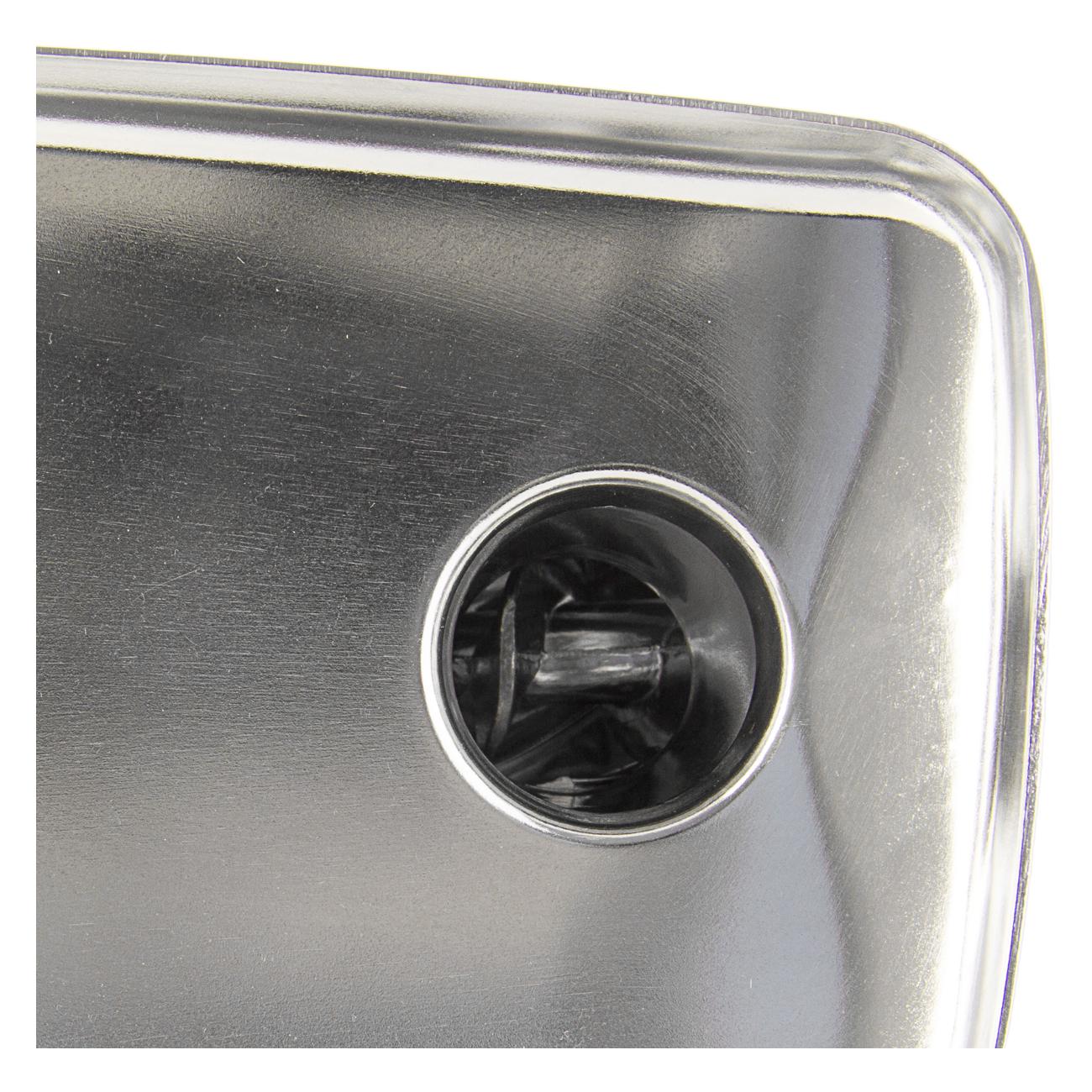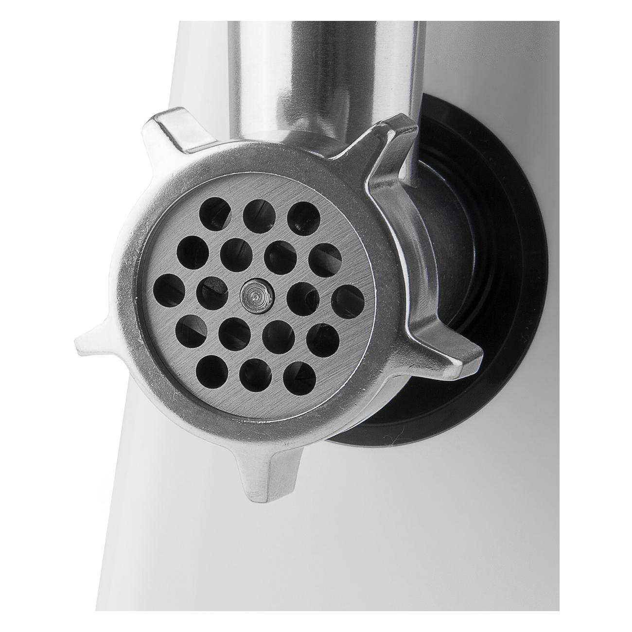 Доступна функция «Реверс», позволяющая быстро избавиться от застрявших кусочков жира и мяса на ножах. Лезвия из стали, устойчивы к образованию коррозии, долго держат заточку. Корпус мясорубки сделан из металла и пластика. Снизу размещены ножки из резины. В случае перегрева устройство отключается автоматически. Скорость перемалывания достигает 1,3 кг/мин.