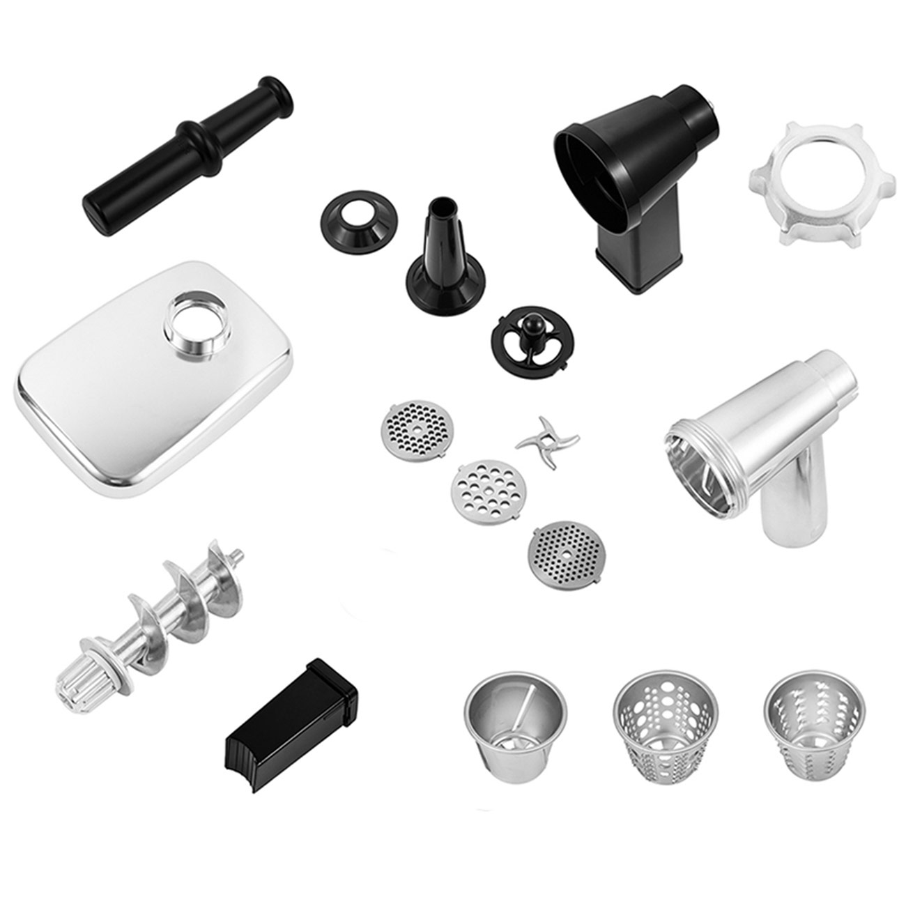 Полезные салаты, сочные котлеты и биточки, сытные кеббе и нежные паштеты – теперь вы без труда сможете удивить свою семью и друзей большим разнообразием вкусных блюд. В комплектацию прибора входят три решётки разного диаметра, шинковка, крупная и малая тёрки и две насадки для приготовления колбасок.