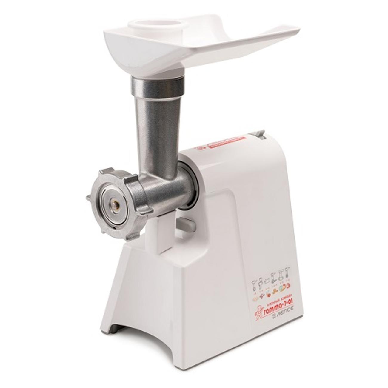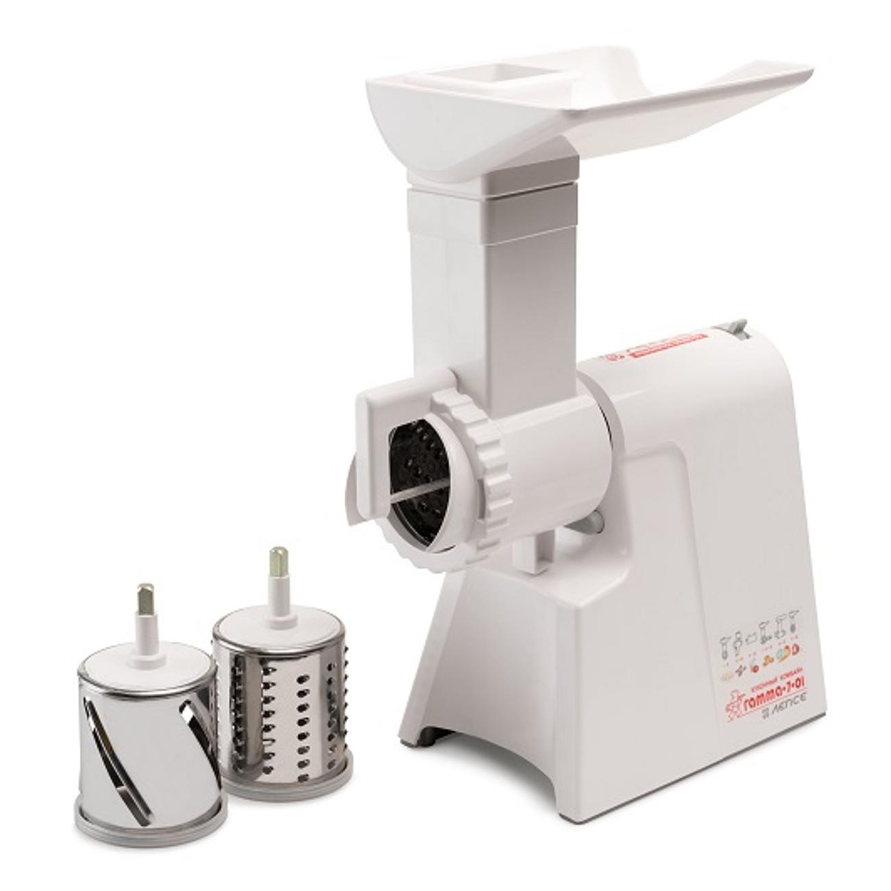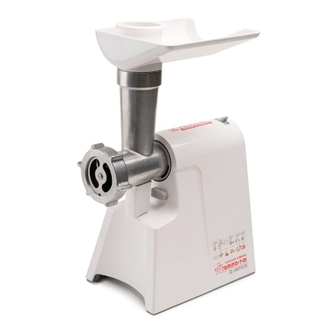 Электромясорубка «Лепсе» «Гамма» 7.1 в белом цвете мощностью 700 Вт способна переработать до 700 г мяса в минуту. В комплекте — три решетки (диаметр отверстий 3 мм, 4,4 мм, 7 мм), три насадки для шинковки и натирания овощей и три насадки для теста.
