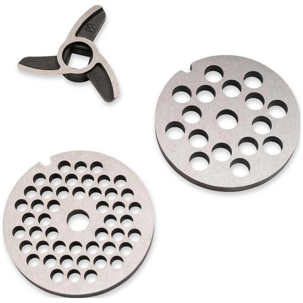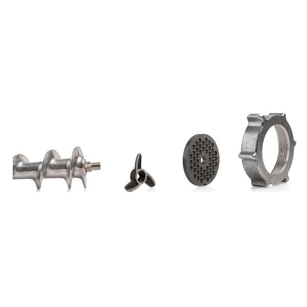 Вместе с мясорубкой поставляются овощерезка с возможностью нарезки, шинкования и натирания (три барабана) и шнековая соковыжималка для получения сока из фруктов и овощей.