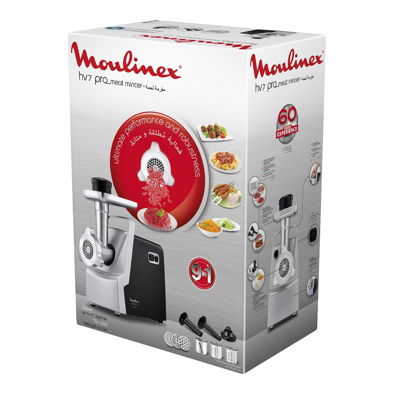 В приборе реализована эффективная система безопасности: прибор не заработает при неправильной или неполной сборке, при перегреве автоматически отключится. Корпус сделан из металла и пластика, снабжен противоскользящими ножками, которые дополнительно снижают уровень вибрации. Для переноски устройства предусмотрена ручка. Габариты мясорубки — 47,8х21х33 см, вес — 5,77 кг.