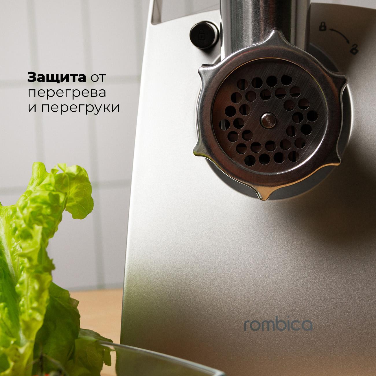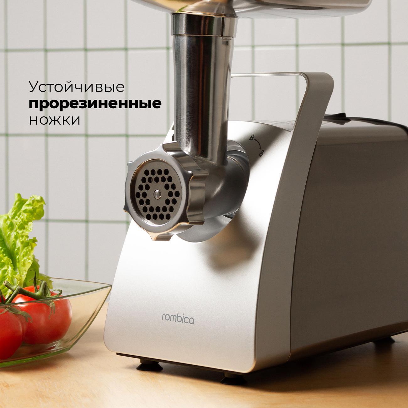 Электромясорубка Rombica MGR-104 предназначена для быстрой обработки мяса и приготовления разнообразных мясных блюд, включая домашние колбасы, сосиски и кеббе. Конструкция обеспечивает непрерывную работу с крупными объемами сырья, подходит для домашнего использования.