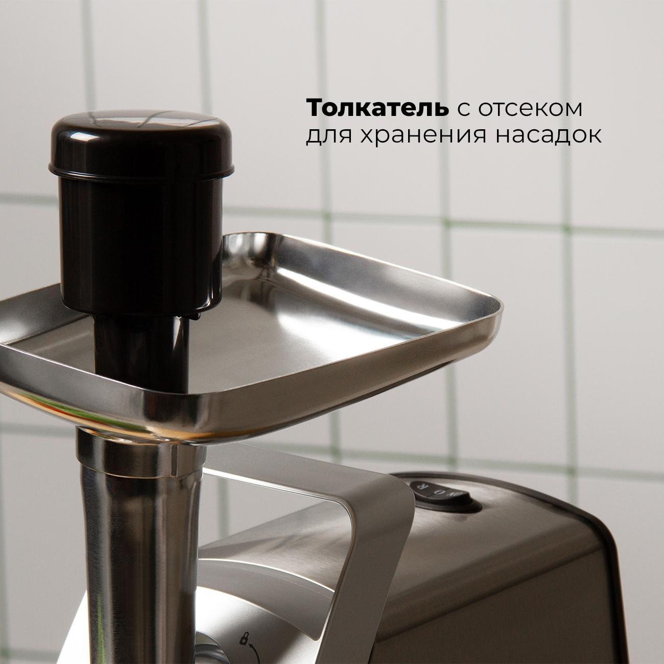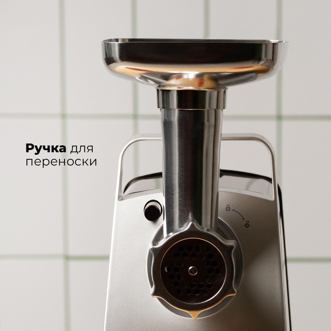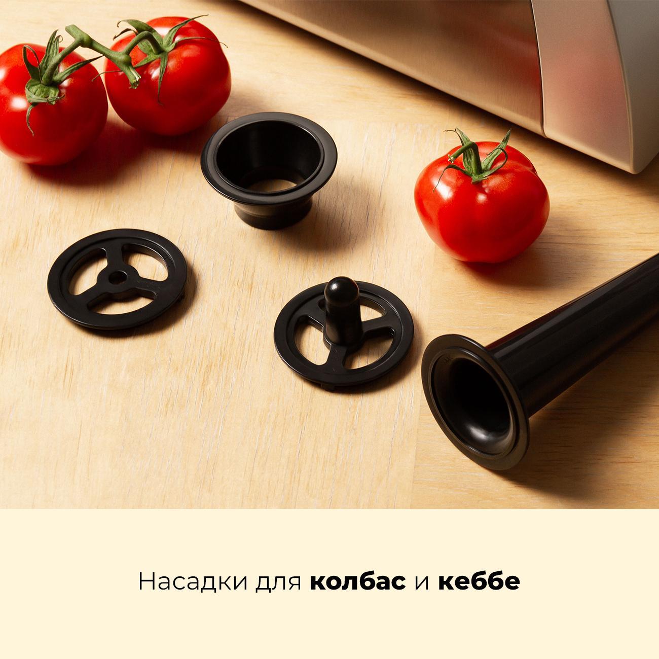 Комплектуется приспособлениями для формирования колбас, сосисок и кеббе, расширяя возможности создания мясных деликатесов дома.