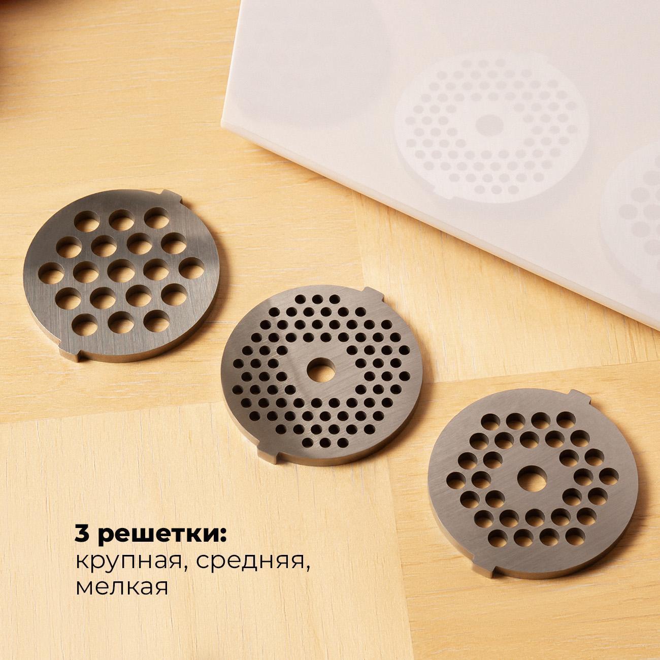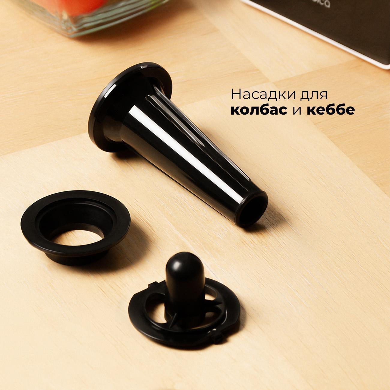 В набор включены три перфорированные решетки (диаметры отверстий 3 мм, 5 мм, 7 мм), насадки для кеббе и приготовления колбас. Возможен формовка фарша разной текстуры, создание полых трубок для начинки или домашних сосисок.