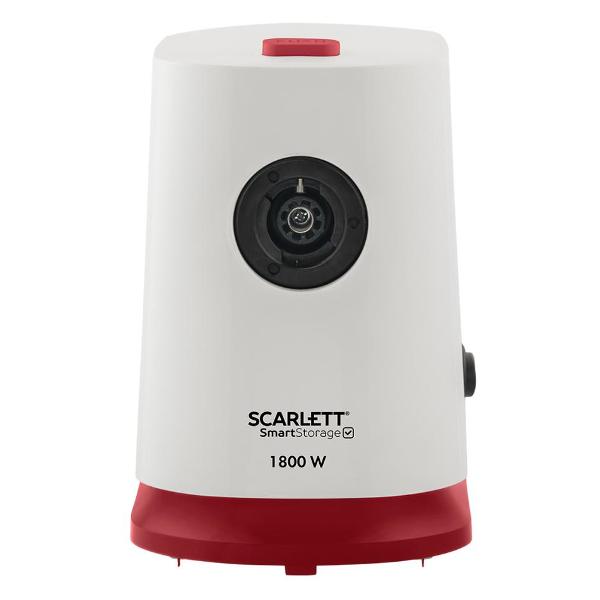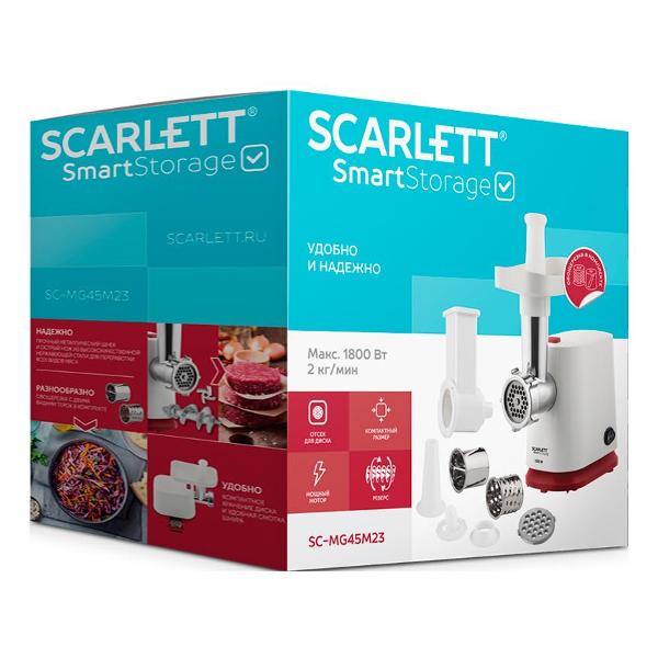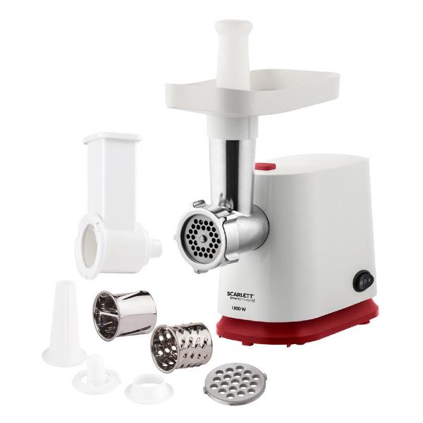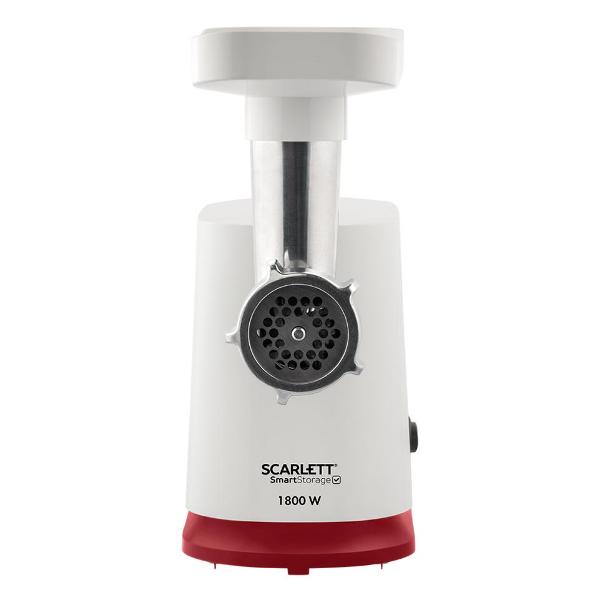 Электромясорубка Scarlett SC-MG45M23, белый/красный обладает мощностью 1,8 кВт и выдает до 2 кг мяса в минуту. У этой модели одна скорость работы. Механический переключатель отвечает за включение и отключение и активирует режим «Реверс», запускающий шнек в обратном направлении, и освобождает его при блокировке намотавшимися жилками или косточкой.
