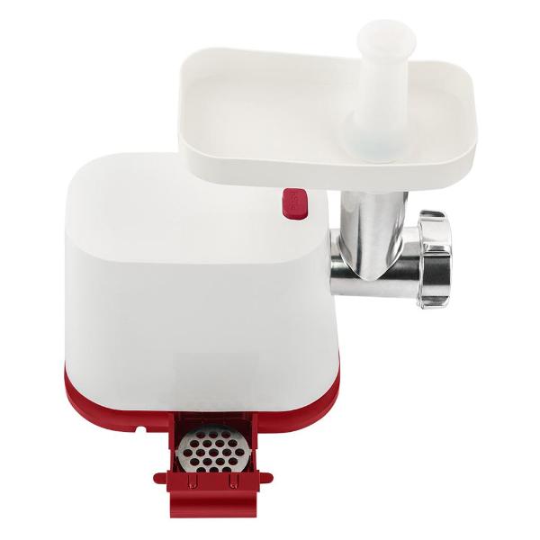 Рабочая камера мясорубки металлическая, нож из нержавеющей стали не боится коррозии и долго удерживает заточку. Камера легко разбирается для промывания. В комплекте поставляются два диска с отверстиями диаметром 5 мм и 7 мм для фарша разной текстуры, насадки для колбасок и кеббе, овощерезка с двумя цилиндрами для натирания и шинкования — устройство многофункциональное и поможет решить разные кулинарные задачи. Для безопасного направления продуктов в камеру прилагается толкатель. При перегреве и риске поломки мясорубка автоматически прекращает работу.