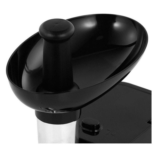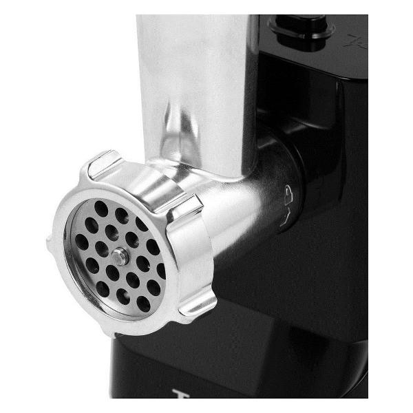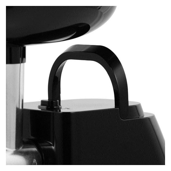 У модели одна скорость работы, предусмотрена функция обратного вращения ножа — реверс. Корпус электромясорубки изготовлен из пластика, как и лоток. Для удобства переноски на корпусе предусмотрена ручка. Шнек сделан из алюминия, съемный нож — из нержавеющей стали. В комплект входят две металлические решетки с разным диаметром отверстий, насадка для приготовления колбас.