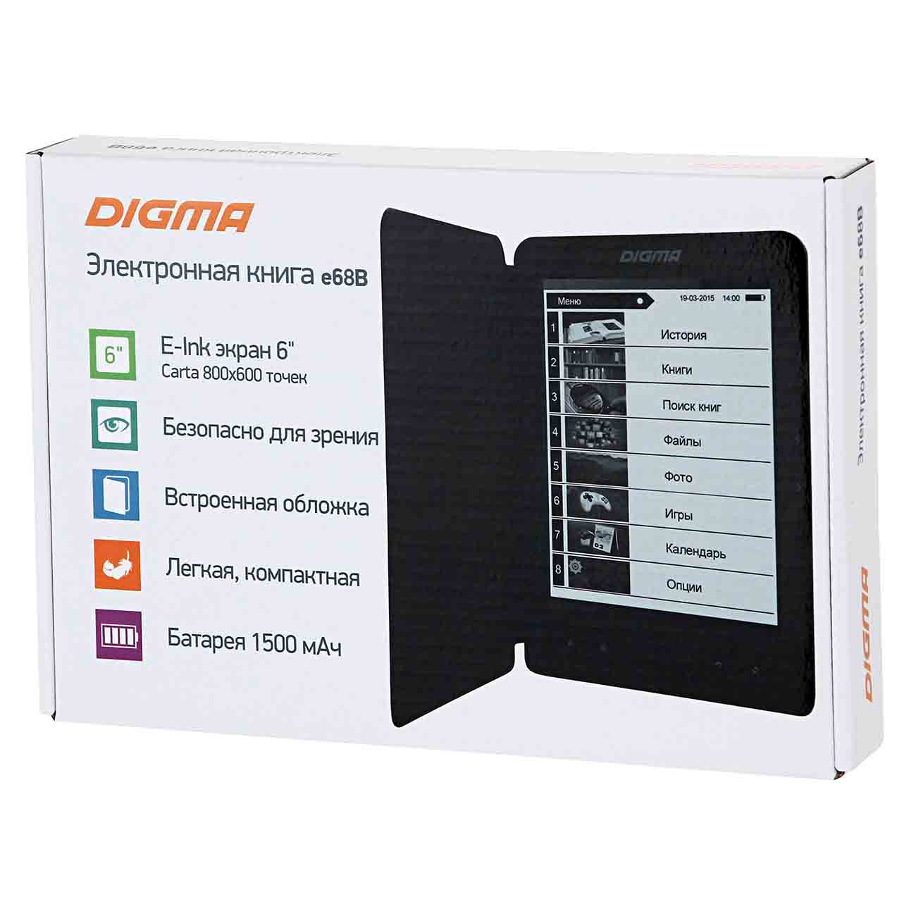 Встроенный файловый менеджер предоставит вам полный доступ к вашей библиотеке, вы без труда найдёте нужную книгу. Устройство управляется при помощи физических кнопок, удобно расположенных в нижней и боковой части корпуса. Digma E68B работает от литий-полимерного аккумулятора ёмкостью 1500 мАч, зарядка производится через интерфейс USB.