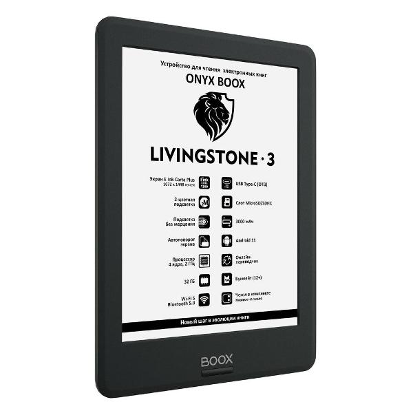 Электронная книга Onyx Boox Livingstone 3 — устройство в пластиковом корпусе черного цвета, для подзарядки которого используется кабель USB Type-C (входит в комплект). Сенсорный экран диагональю 6" обладает разрешением 1072х1448 Пикс, что обеспечивает улучшенную детализацию. Плотность Пикс — 300 ppi. Предусмотрена мягкая, комфортная для длительного чтения подсветка. Технология E-Ink Carta plus обеспечивает экрану улучшенную контрастность. В качестве операционной системы используется Android 11. Она предоставляет доступ к широкому функционалу и магазину с сотнями бесплатных приложений.