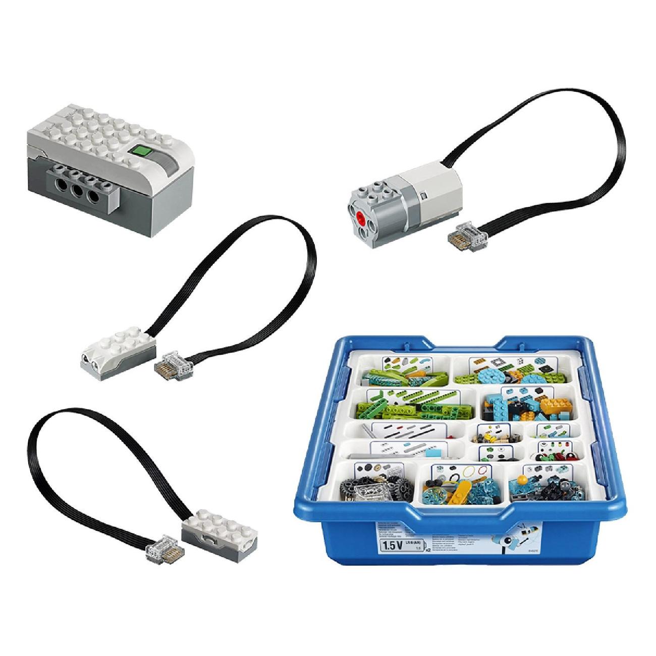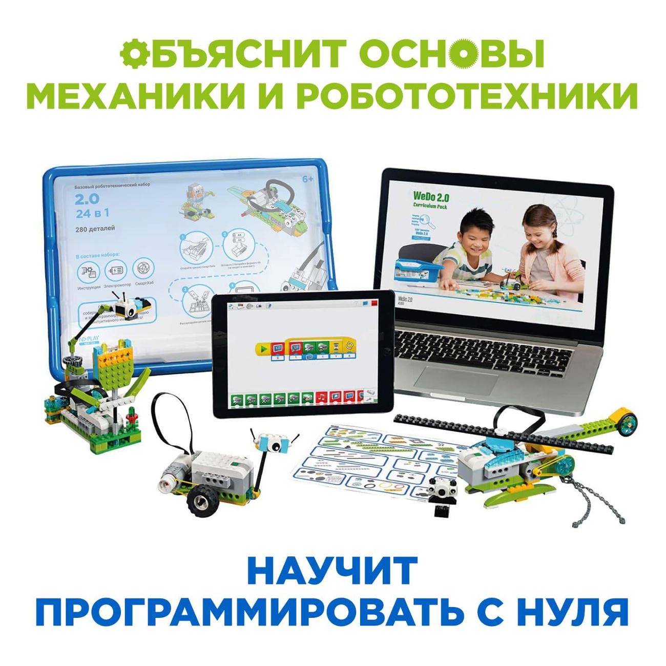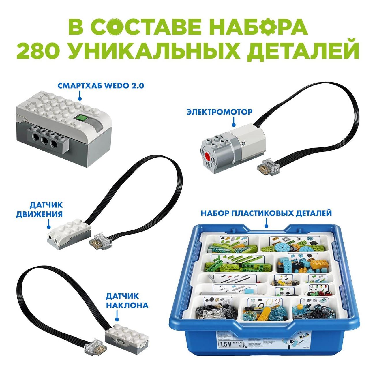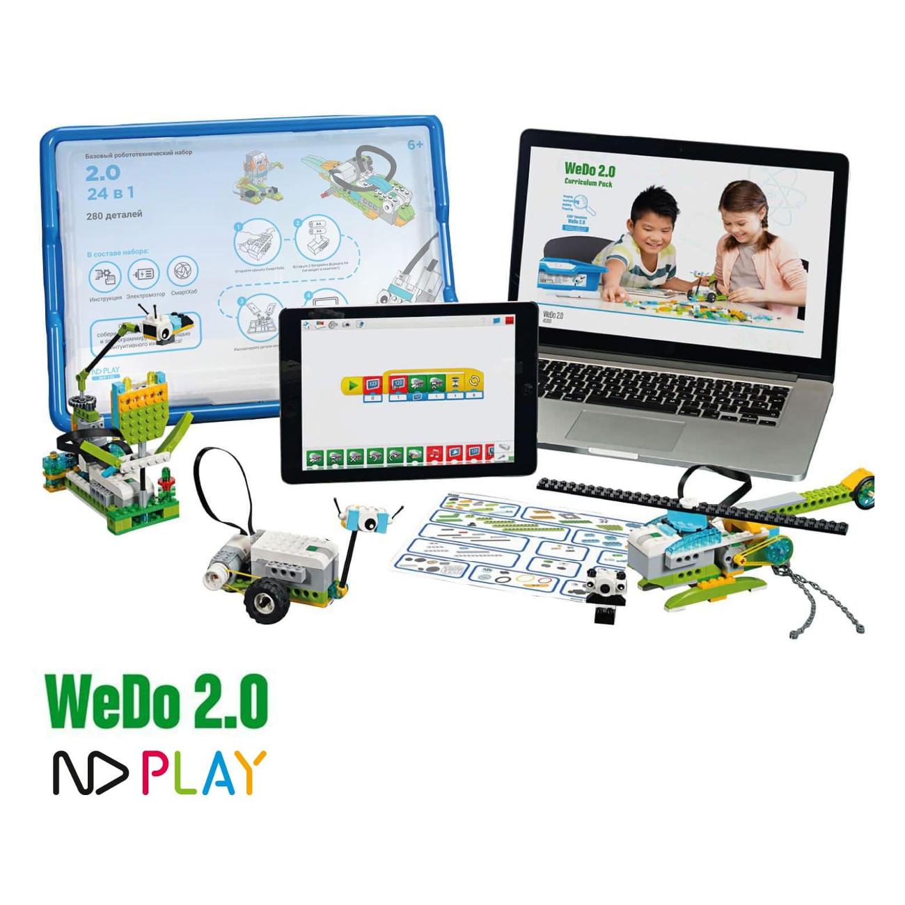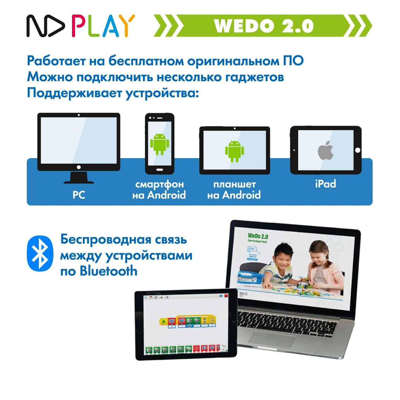Электронный конструктор ND Play WeDo синего цвета обладает габаритами 10х31х42 см. Масса прибора — 1,05 кг. Питание осуществляется от батарей типа АА. Корпус изготавливается из пластика. Относится к электромеханическому типу. Встроен модуль Bluetooth. В комплект входят 280 деталей.