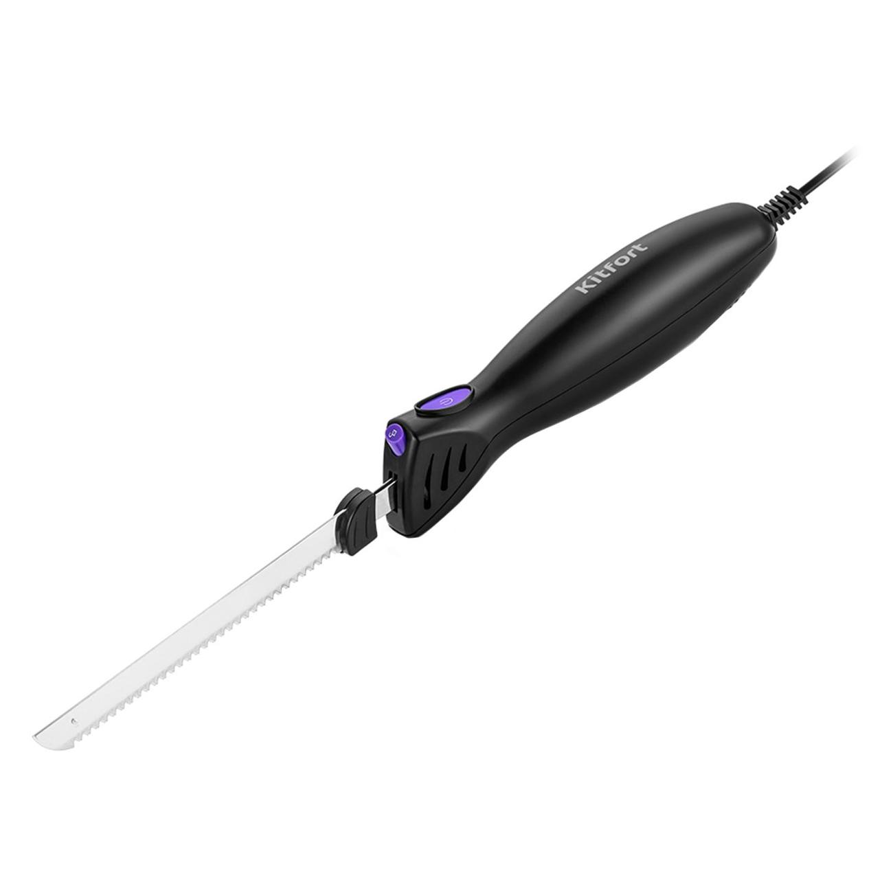 Электронож Kitfort КТ-4071 предназначен для нарезки продуктов. Управление осуществляется одним нажатием кнопки. Габаритные размеры 5,5x5,5x43,5 см, вес — 0,47 кг. Корпус и ручка изготовлены из пластика, лезвие — нержавеющяя сталь. Съемные лезвия облегчают процесс чистки и обслуживания ножа. Цвет корпуса и ручки ножа — черный. Произведено в Китае. Гарантийный срок — один год.