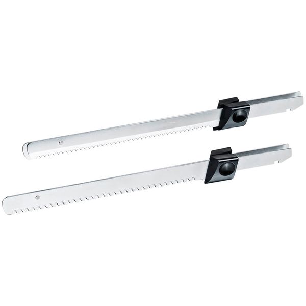 В комплекте поставляются две сменных насадки с разными лезвиями из нержавеющей стали. Лезвие с мелкими зубьями подходит для нарезки мягких продуктов, с большими зубьями — для нарезки твердых или замороженных продуктов. Насадки подходят для мытья в посудомоечной машине. Корпус изделия с эргономичной ручкой изготовлен из пластика. Устройство работает от сети.