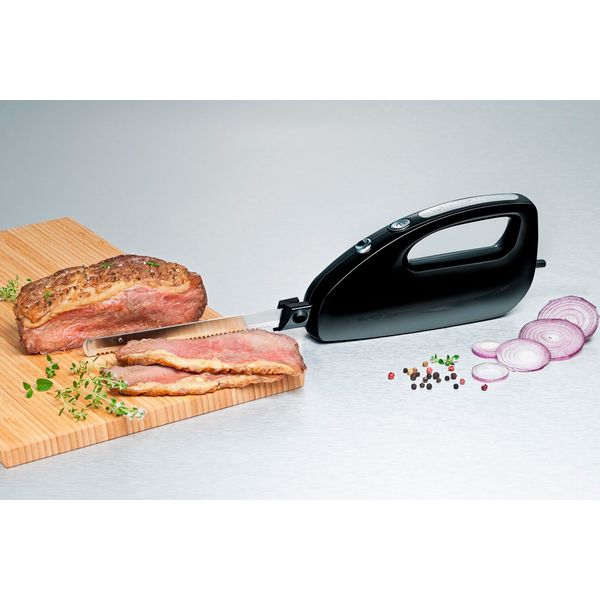 Электронож Rommelsbacher EM 150 оборудован бесшумным двигателем с низким уровнем вибраций мощностью 120 Вт. Длина устройства — 40 см, длина рабочего лезвия — 15 см. Весит электронож 780 г. Прибор оснащен защитой пальцев от порезов.