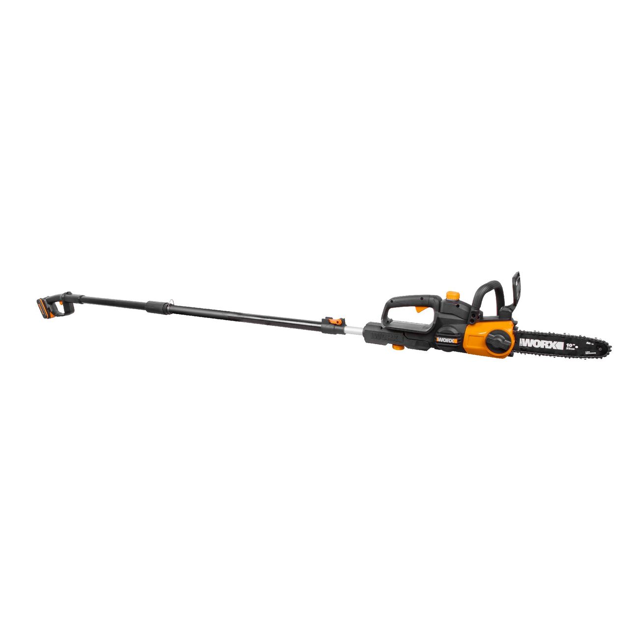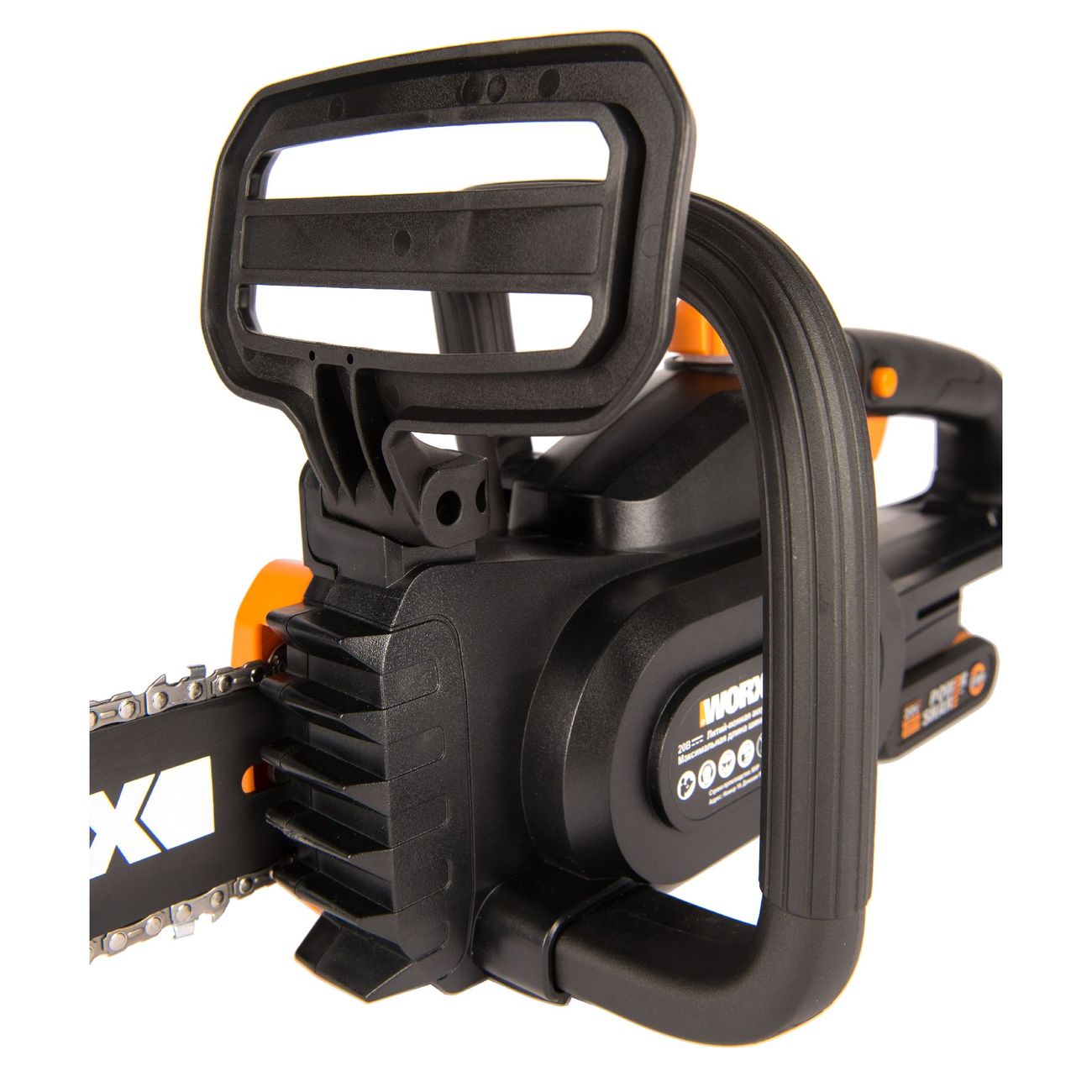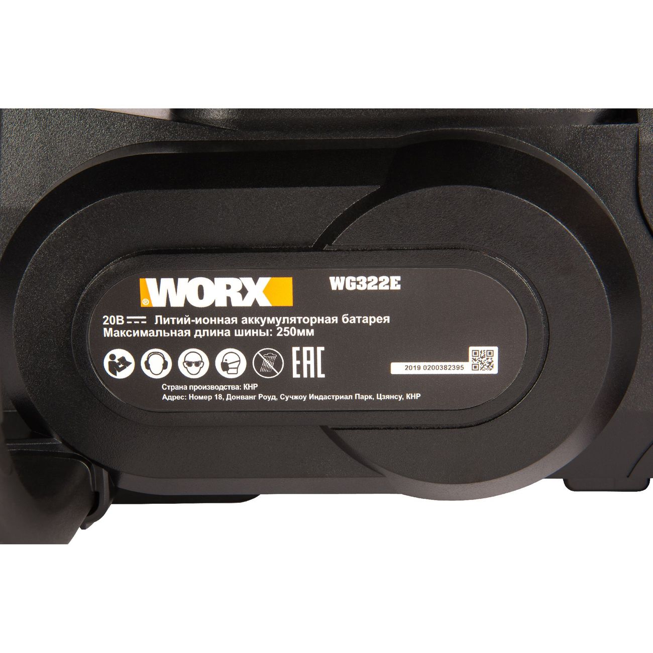 Worx WG322E — цепная электропила с поперечным расположением двигателя щеточного типа. Мотор дополнен электронной защитой. Модель оснащена 40-звенной цепью, которая движется со скоростью 3,7 м/с. Она натягивается без дополнительных инструментов.