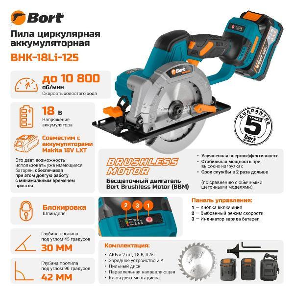 Вы можете купить Электропила циркулярная Bort BHK-18Li-125 (2*3,0 Ач + ЗУ) в магазинах М.Видео по доступной цене. Электропила циркулярная Bort BHK-18Li-125 (2*3,0 Ач + ЗУ): подробное описание, фото и отзывы реальных покупателей, характеристики, возможность скачать инструкции и подобрать аксессуары.