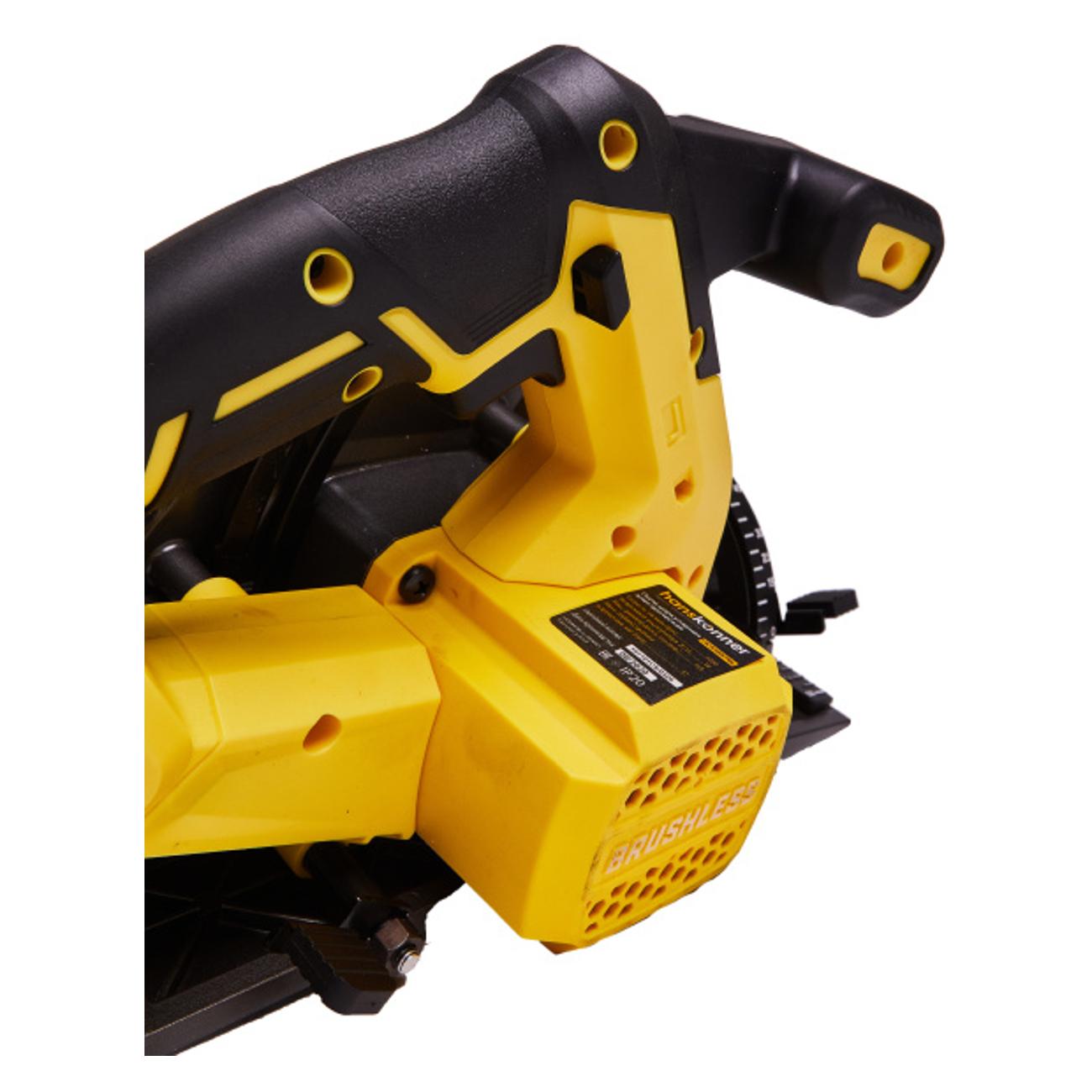 Циркулярная электропила Hanskonner HCS1857BL желтого цвета с черными элементами обладает весом 2,8 кг. Питание осуществляется от аккумулятора типа Li-Ion напряжением 18 В. В комплекте поставляются пильный диск, параллельная направляющая и шестигранный ключ.