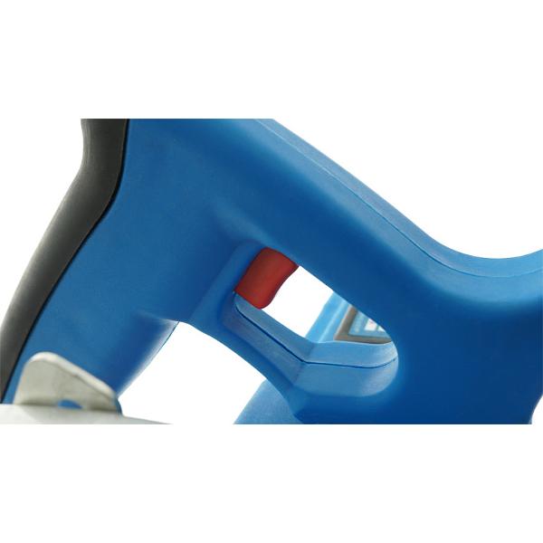 Инструмент представлен в прочном и устойчивом к механическому воздействию корпусе из ABS-пластика. Для удобного хвата и улучшенного контроля предусмотрена рукоятка, дополненная резиновой противоскользящей вставкой. Гибкий двухметровый кабель с устойчивостью к низким температурам обеспечивает стабильное питание и мобильность. Блокировка шпинделя производится без каких-либо инструментов, что упрощает и ускоряет процесс замены оснастки. Потребляемая мощность — 1300 Вт.