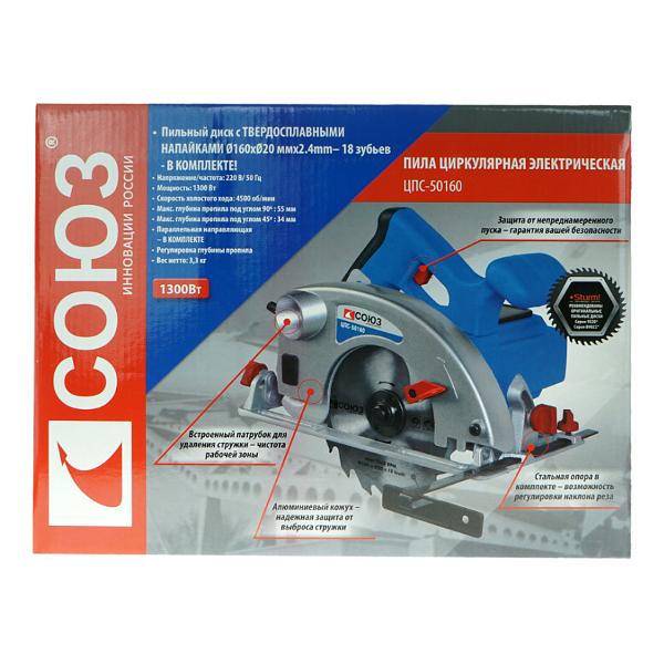 Циркулярная электропила «Союз» ЦПС-50160 — устройство для бытового и профессионального использования, снабженное 160-миллиметровым диском. Подходит для выполнения пропилов в древесине, ДВП, ДСП и других материалах. Диаметр посадочного отверстия составляет 20 мм. Максимальная скорость вращения оснастки доходит до 4500 об/мин, что способствует высокой производительности.